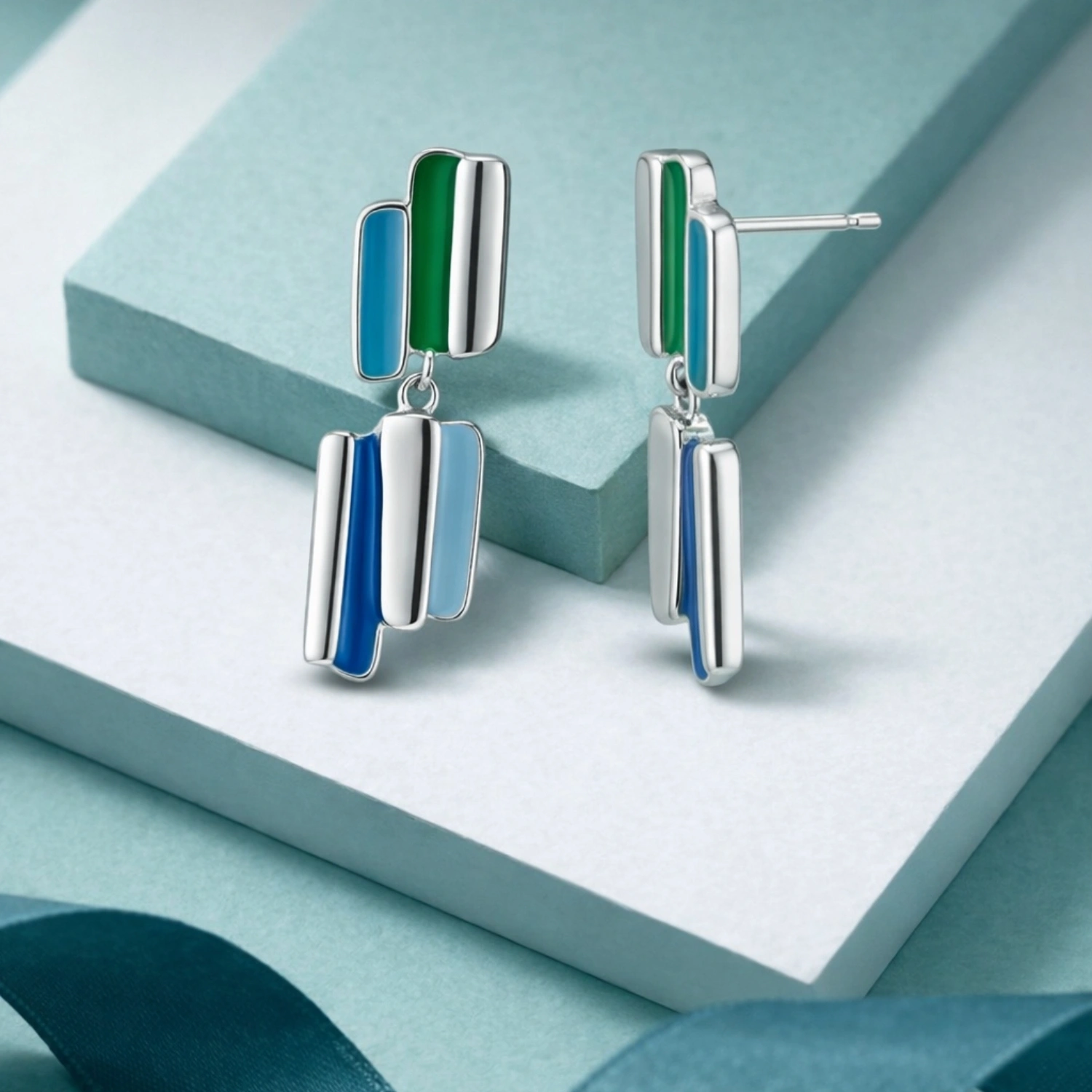 Modern 925 silver earrings featuring vibrant multi-color enamel panels in a contemporary tiered design.