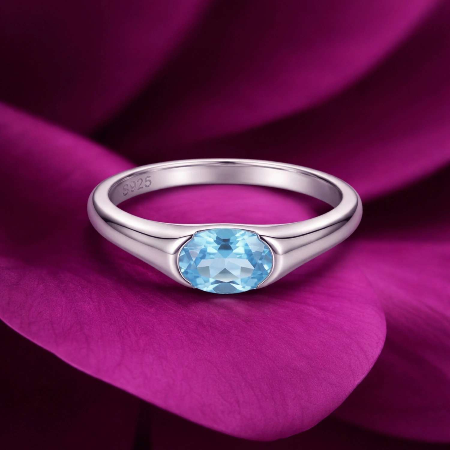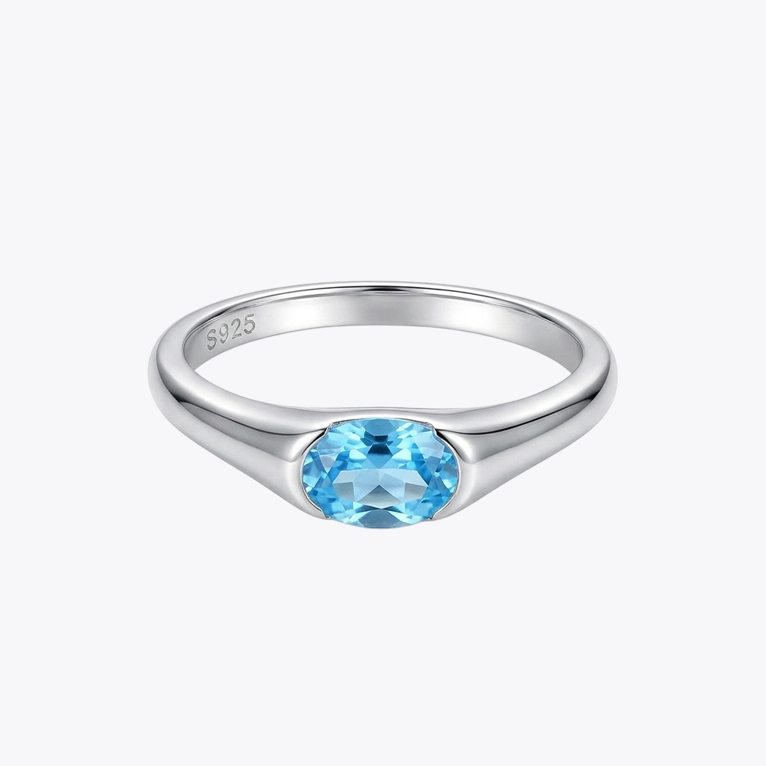 A refreshing 925 sterling silver ring highlighting a serene, oval-cut aqua blue gemstone set in a smooth band.