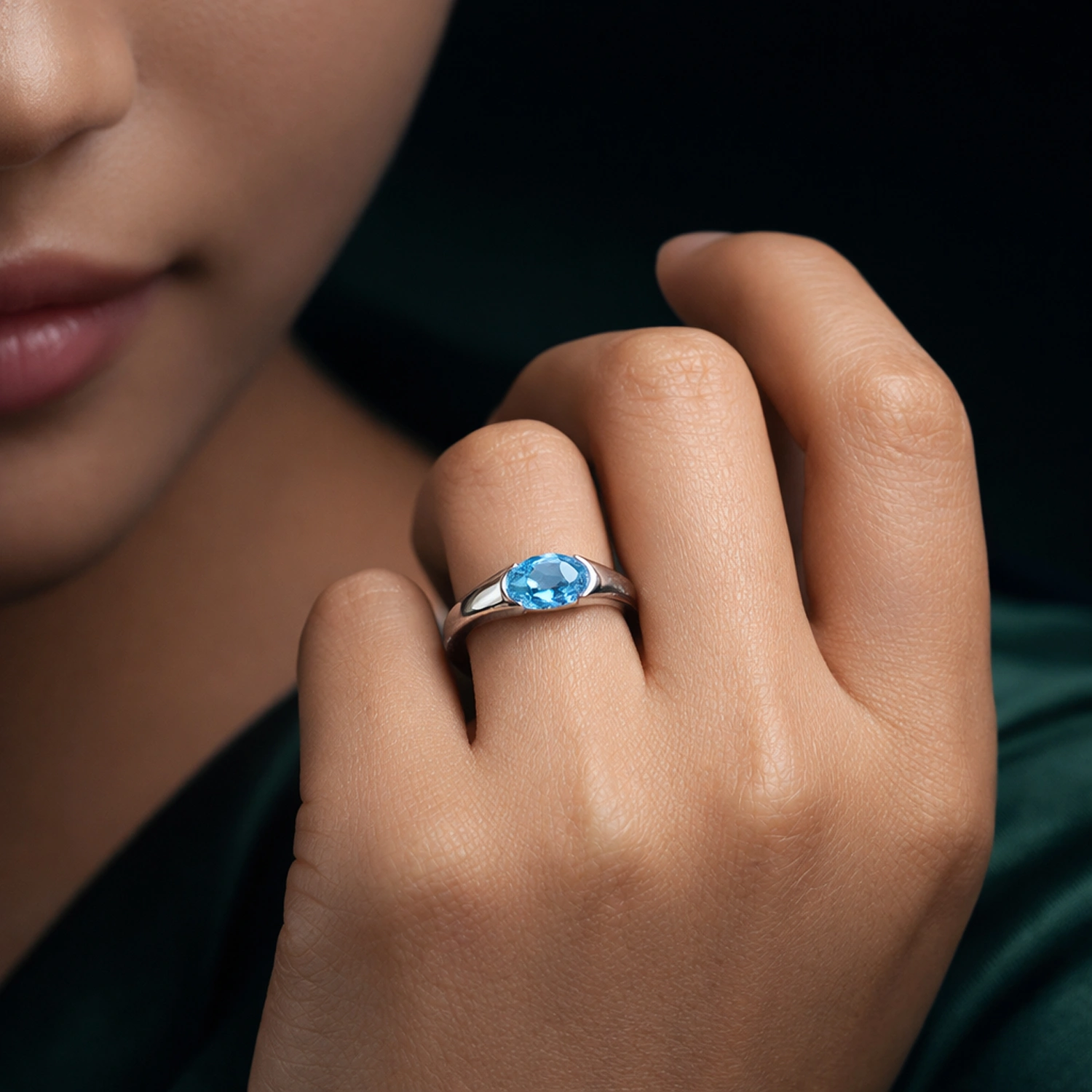 The Alencia Aqua Oval Silver Ring is a refreshing 925 sterling silver piece featuring a serene aqua blue oval gemstone set in a sleek, modern band for a clean and elegant look.