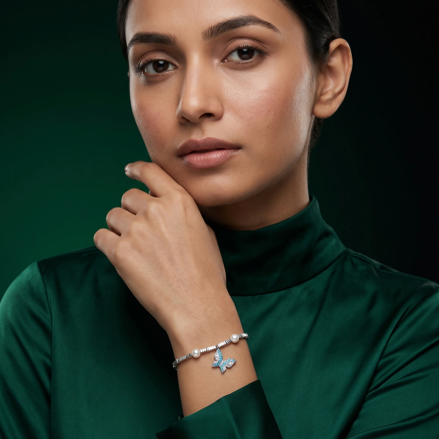 The ALENCIA Azure Blossom Crystal & Pearl Bracelet is a radiant floral-inspired piece crafted in premium 925 sterling silver, designed to capture the freshness and elegance of blooming spring flowers. Featuring striking blue and clear crystals paired with a luminous central pearl, this bracelet blends vibrant color with timeless sophistication. Its delicate floral design makes it a graceful statement accessory for both special occasions and refined everyday styling.