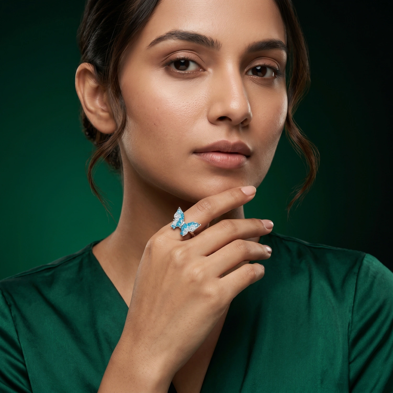 Pair this set with a simple white dress, pastel saree, soft blue outfit, silk blouse, or neutral formal wear to let the vivid blue crystals become the statement focus. Its fresh floral silhouette makes it especially perfect for spring and daytime luxury styling.