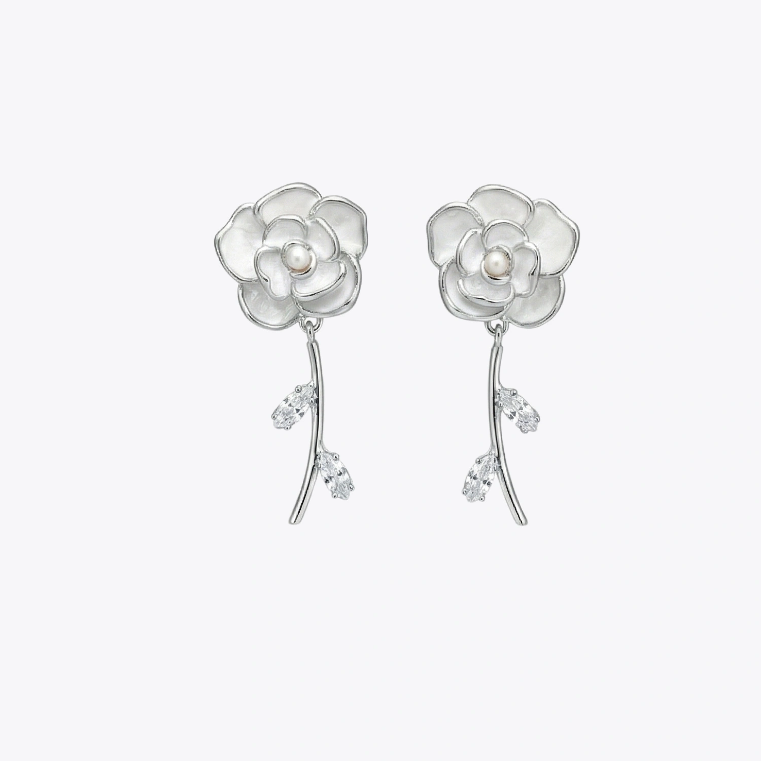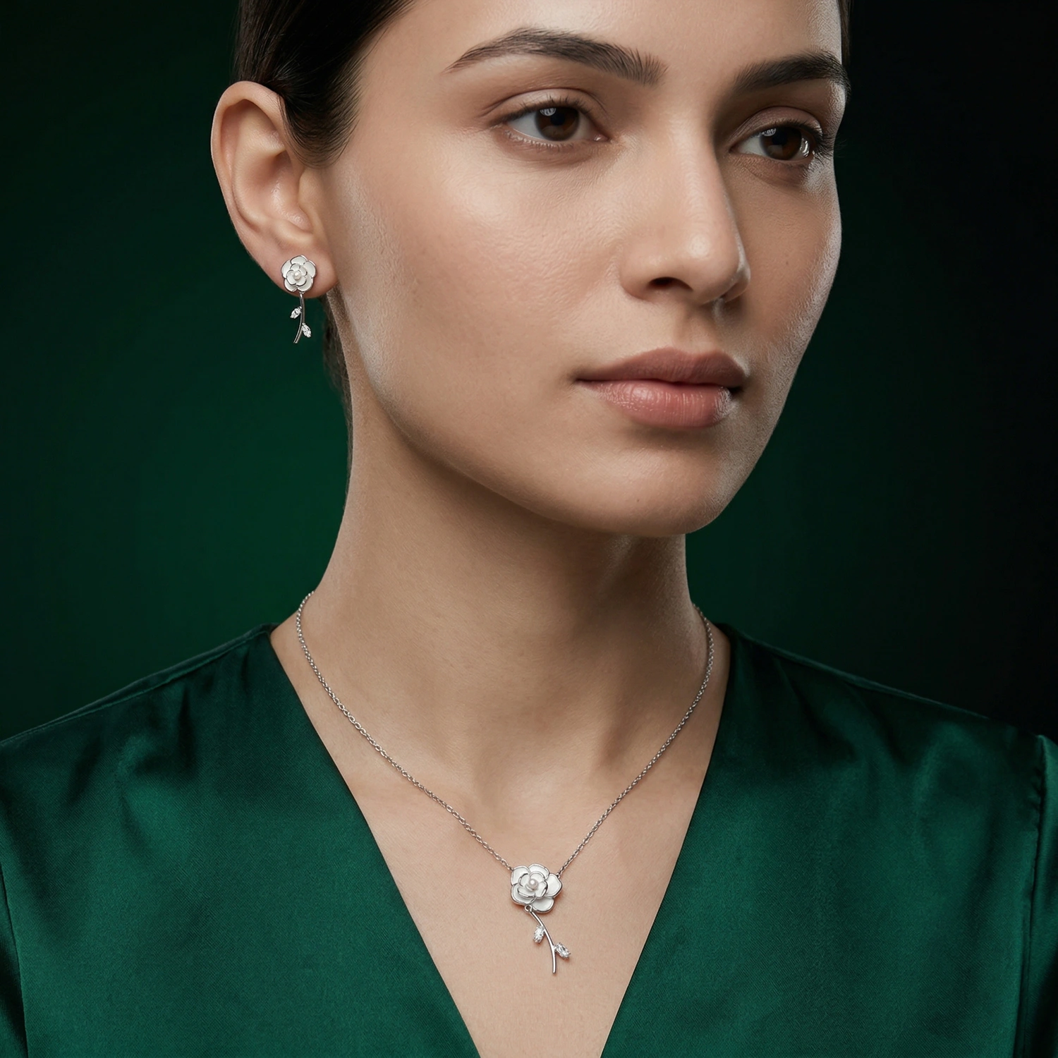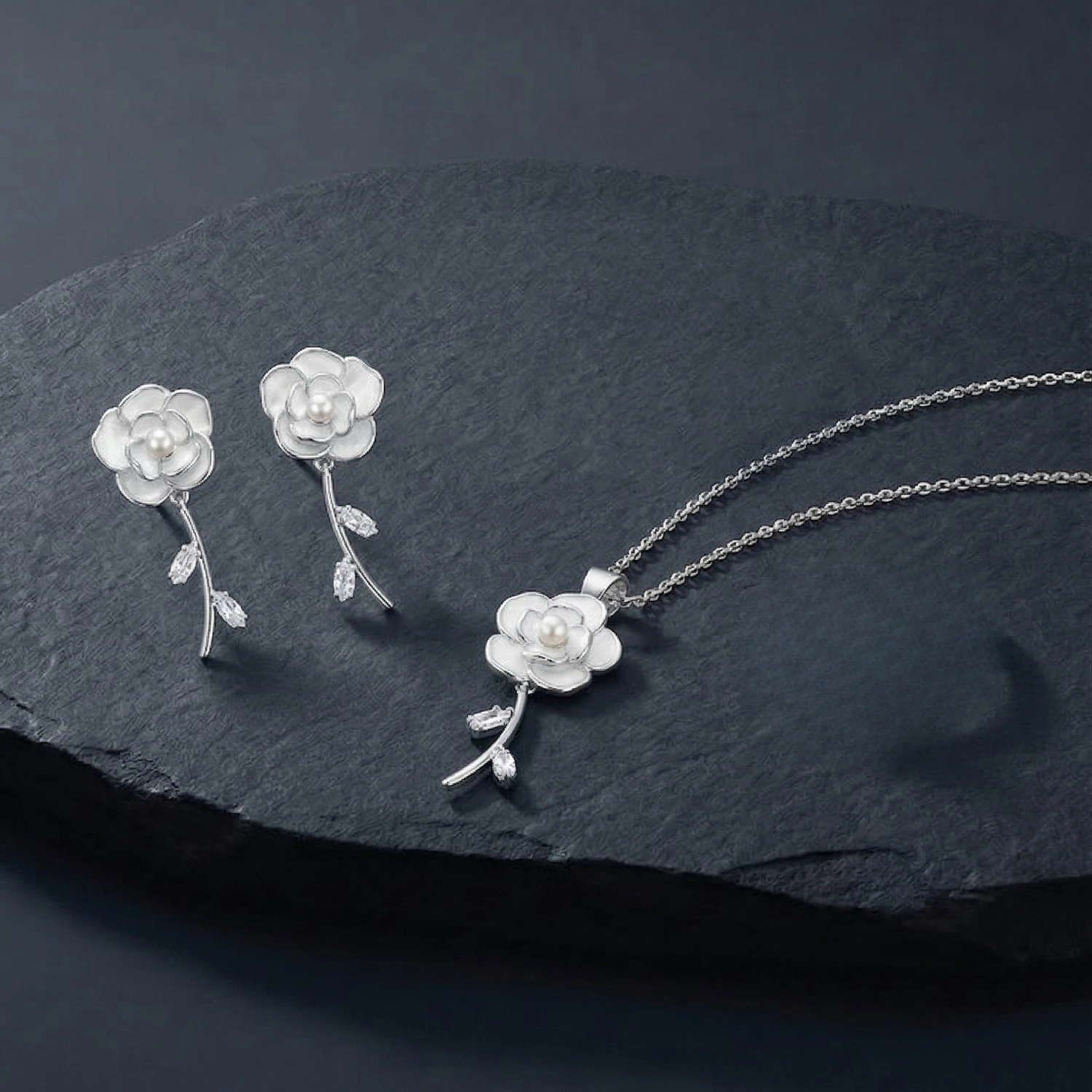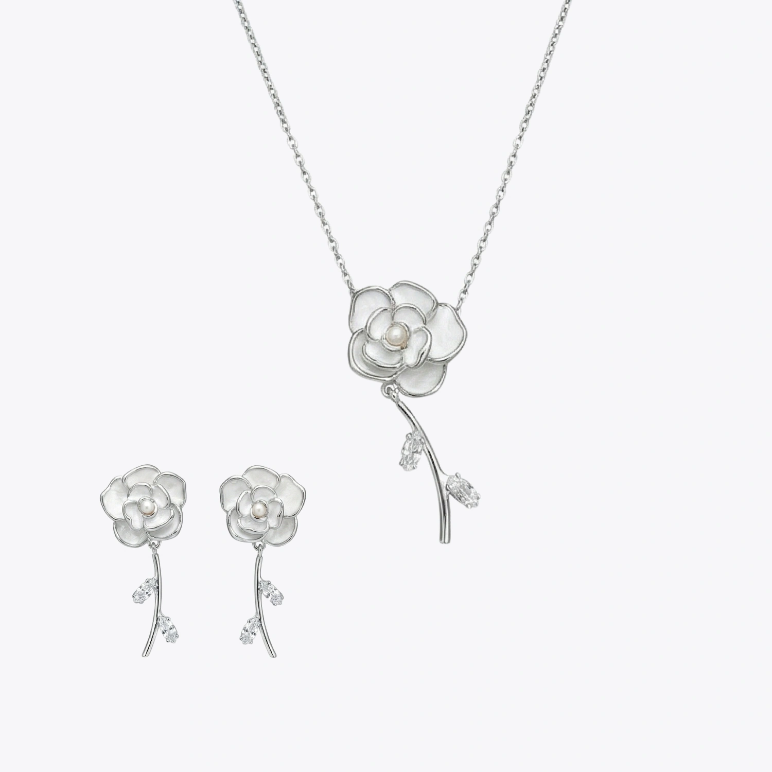 Each five-petal floral motif is beautifully crafted with hand-set cerulean blue crystals that capture light from every angle, while a central pearl adds softness and classic elegance. The polished 925 sterling silver base enhances the brilliance of the vivid blue stones, giving the entire set a refined and luxurious finish. Its floral silhouette offers a refreshing feminine charm that feels both modern and timeless.