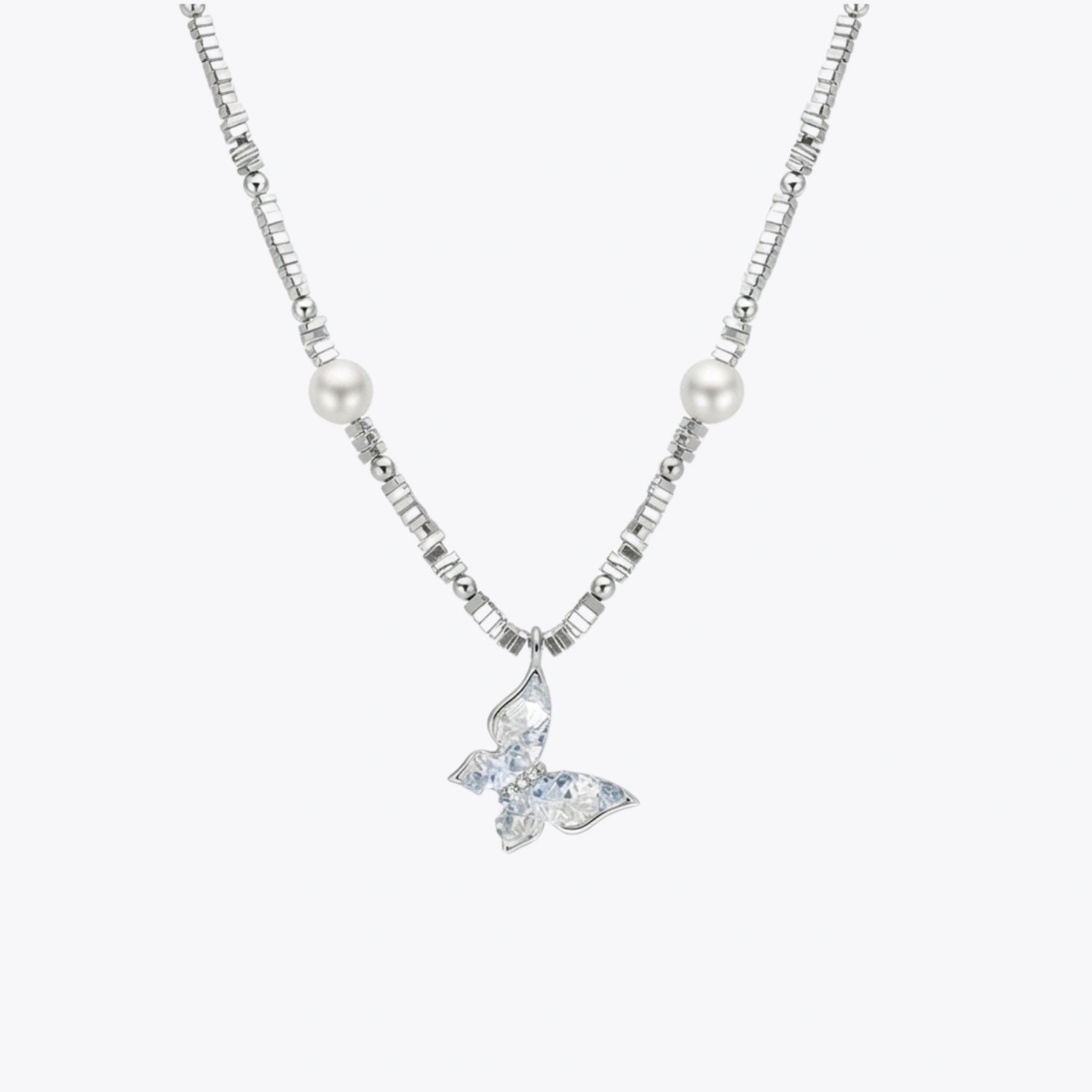 This enchanting collection features marquise-cut light blue crystals arranged as delicate butterfly wings, accented with elegant dainty pearls for timeless softness. The butterfly motifs create a graceful nature-inspired statement, while the unique square-link chain adds a fresh modern edge.