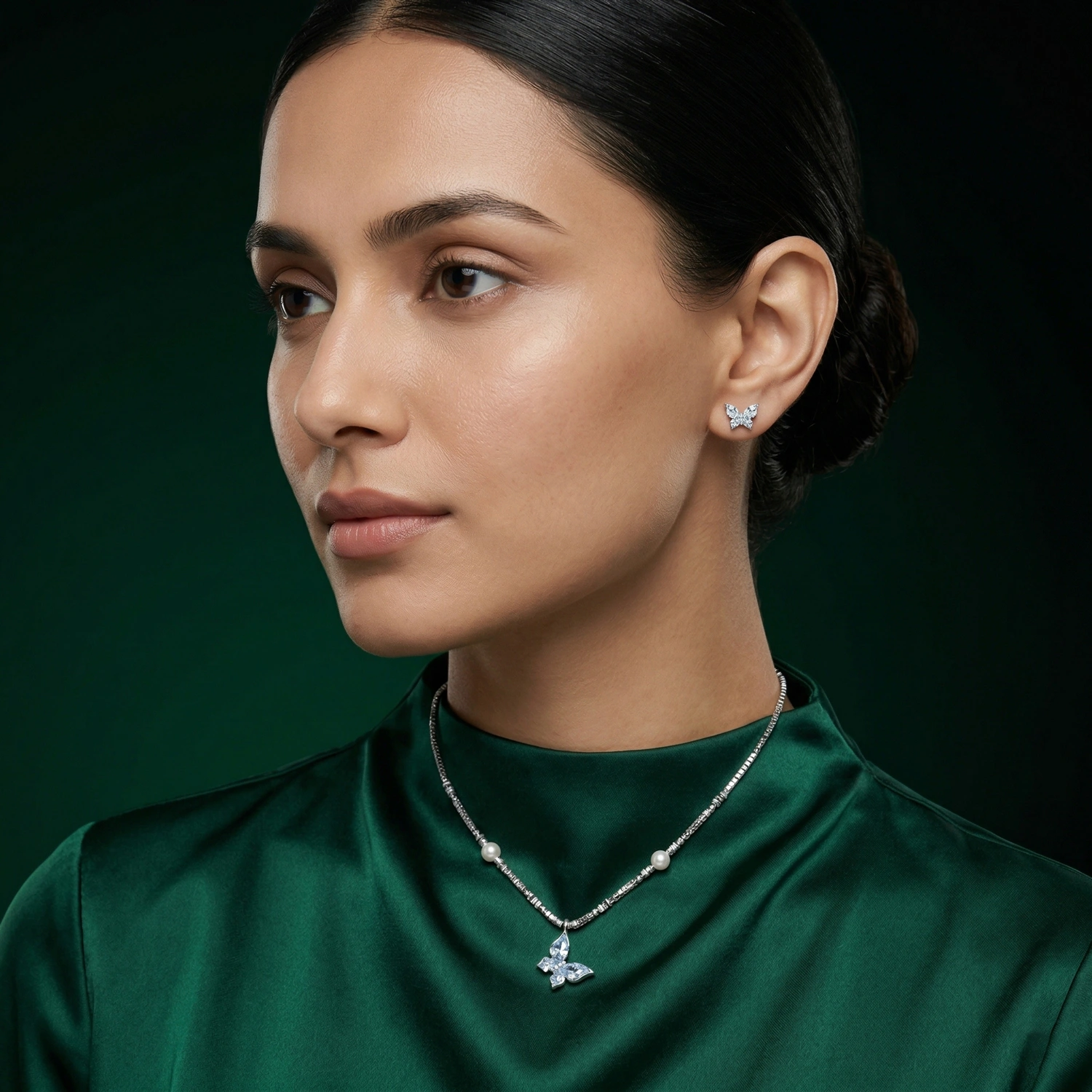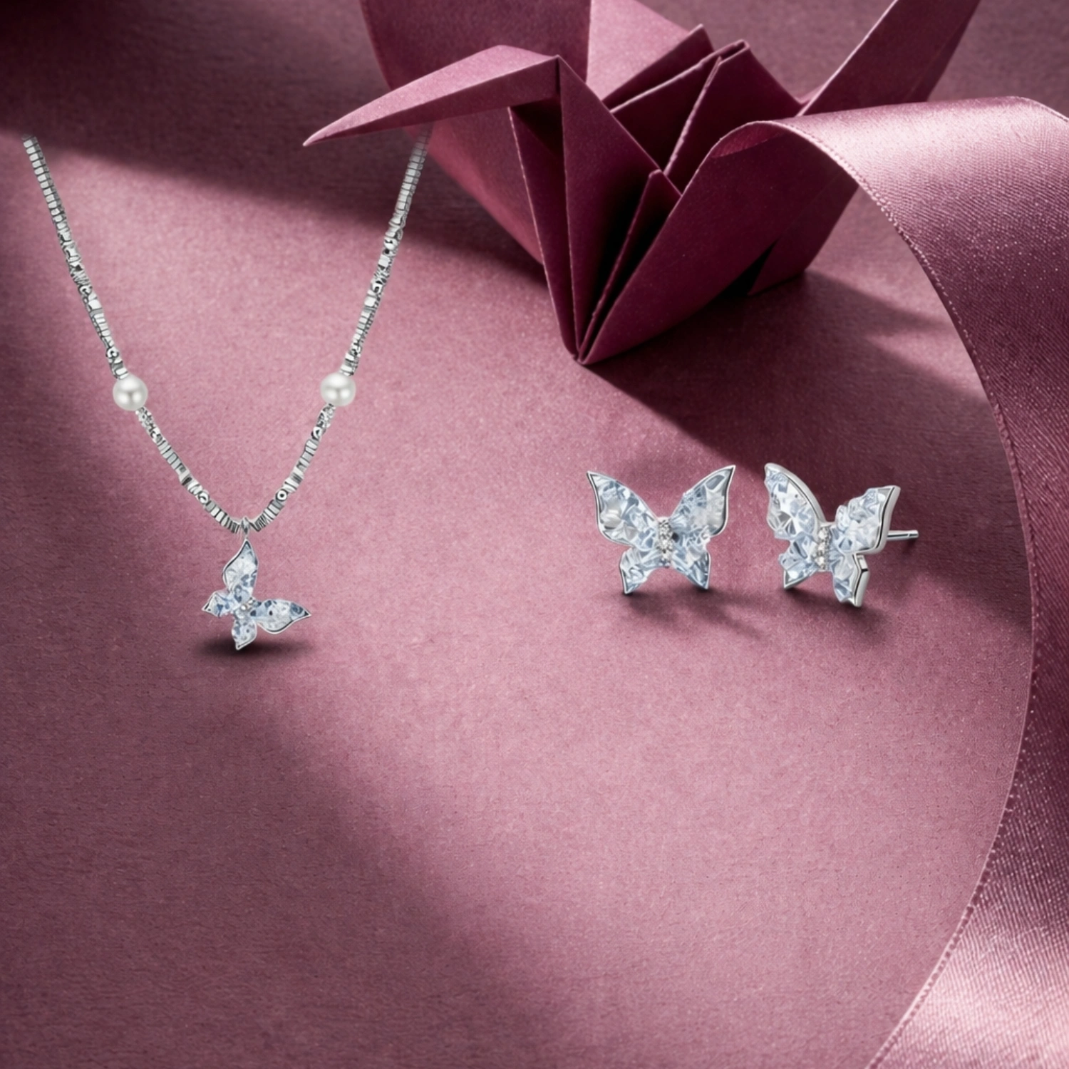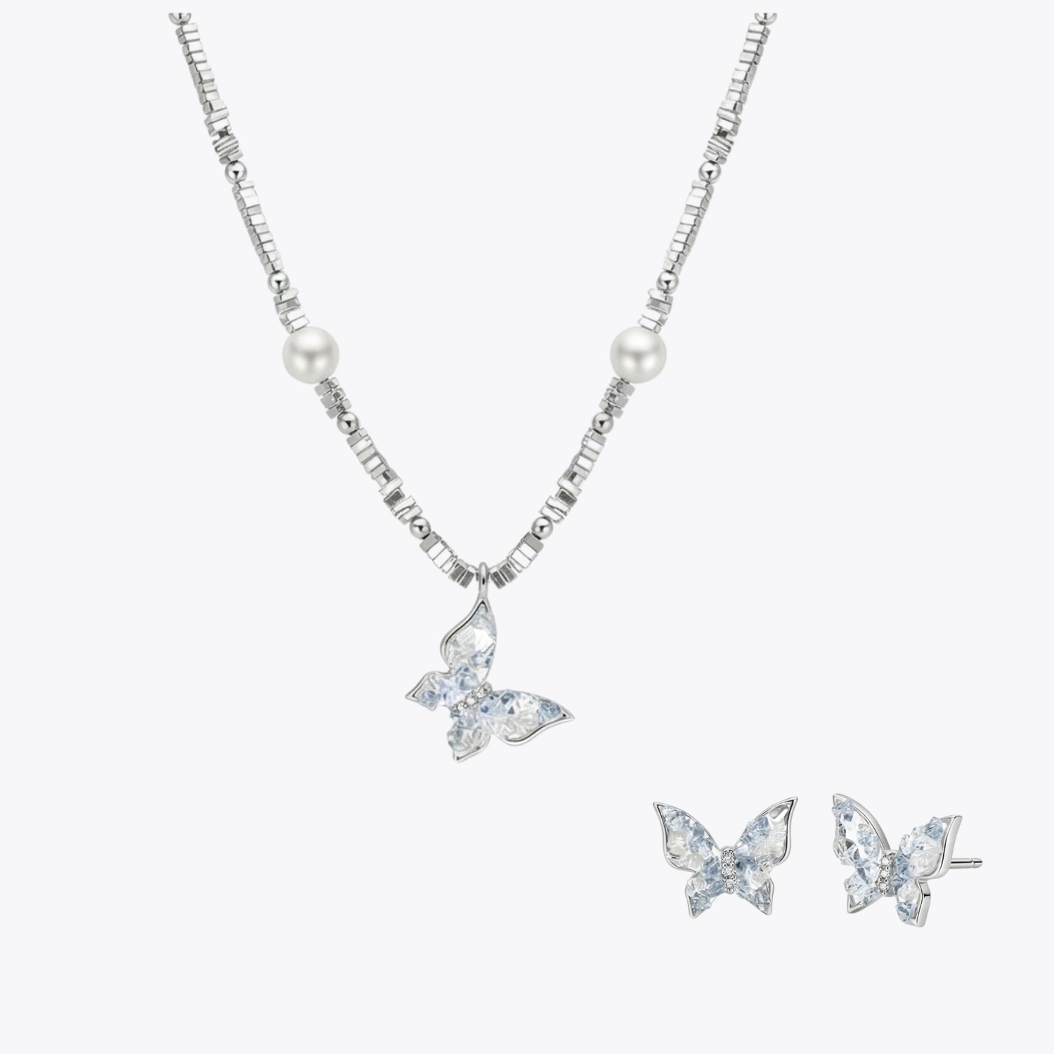 The ALENCIA Butterfly Wings Crystal & Pearl Silver Set is a whimsical 925 sterling silver collection designed to capture ethereal beauty and feminine charm. Featuring shimmering crystal butterfly motifs accented with delicate pearls, this enchanting set brings together nature-inspired elegance and modern sophistication.
