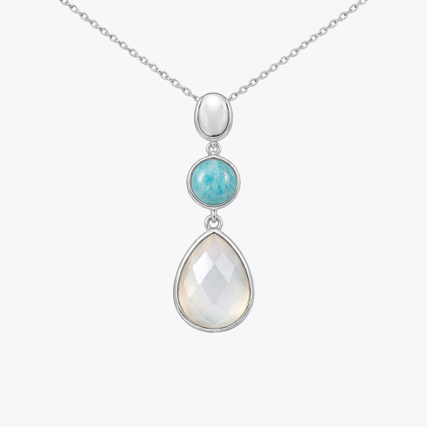 Designed with a refined three-tier drop silhouette, each piece begins with a polished silver stud that flows into a smooth round amazonite cabochon, followed by a faceted pear-shaped white chalcedony stone for soft shimmer and elegant vertical drama. The soothing gemstone tones create a cooling, ocean-inspired palette, while the rhodium-plated sterling silver adds sleek brilliance and long-lasting shine.