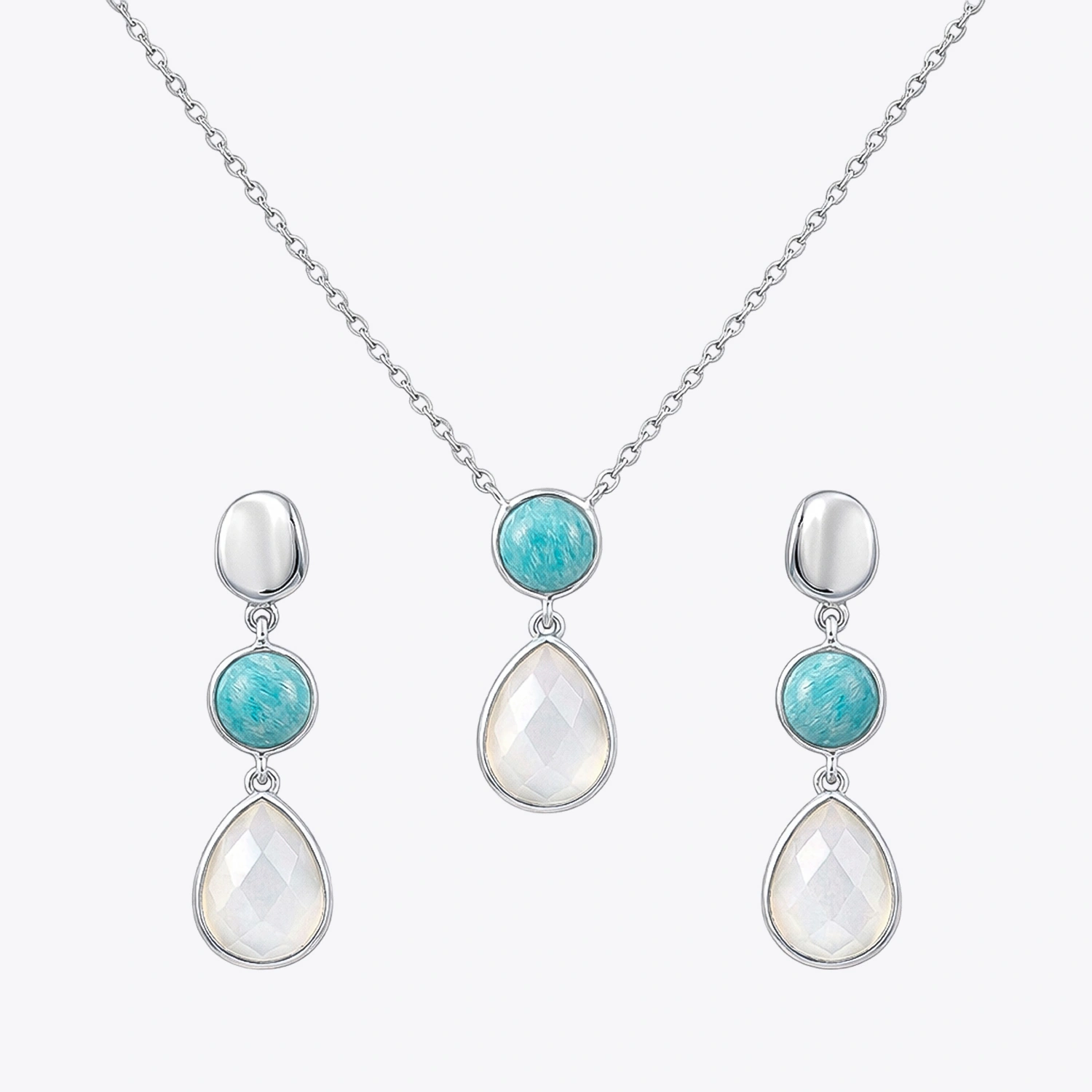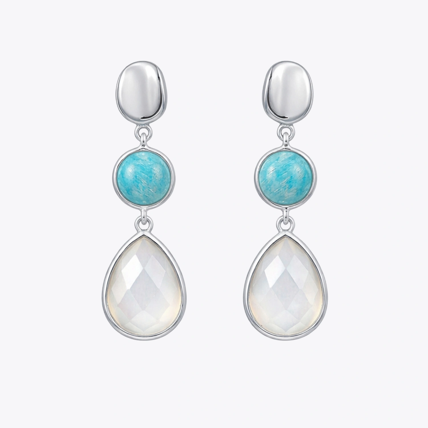 This elegant set features a graceful three-tier drop motif with a polished silver stud, smooth round amazonite cabochon, and faceted pear-shaped white chalcedony. The layered gemstone composition creates fluid movement and a beautifully elongated silhouette.