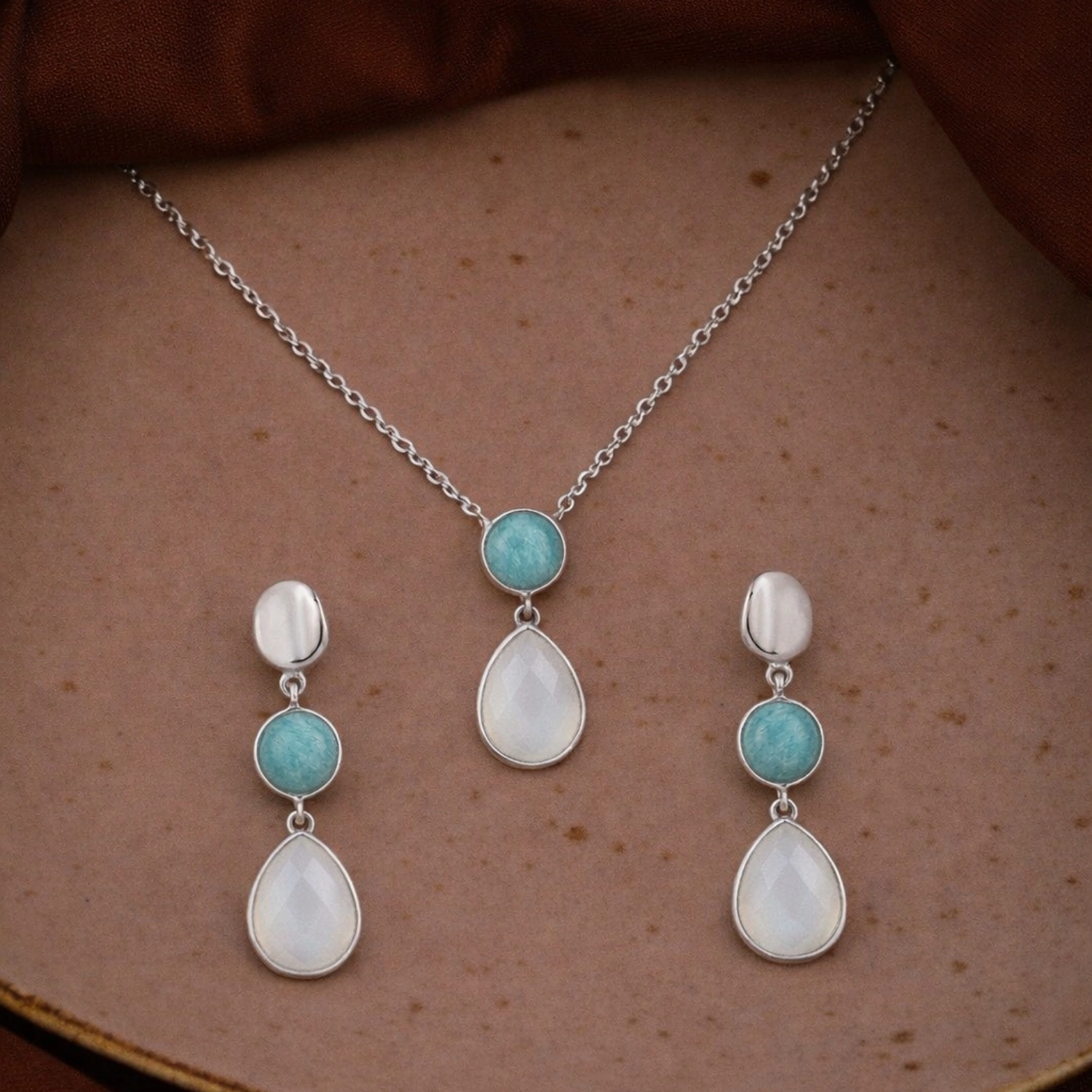 A serene 925 sterling silver necklace and earring set featuring turquoise amazonite, white chalcedony, and a graceful three-tier drop design. Styled in coastal luxe elegance, this gemstone duo is perfect for vacations, beach weddings, and chic daily wear.