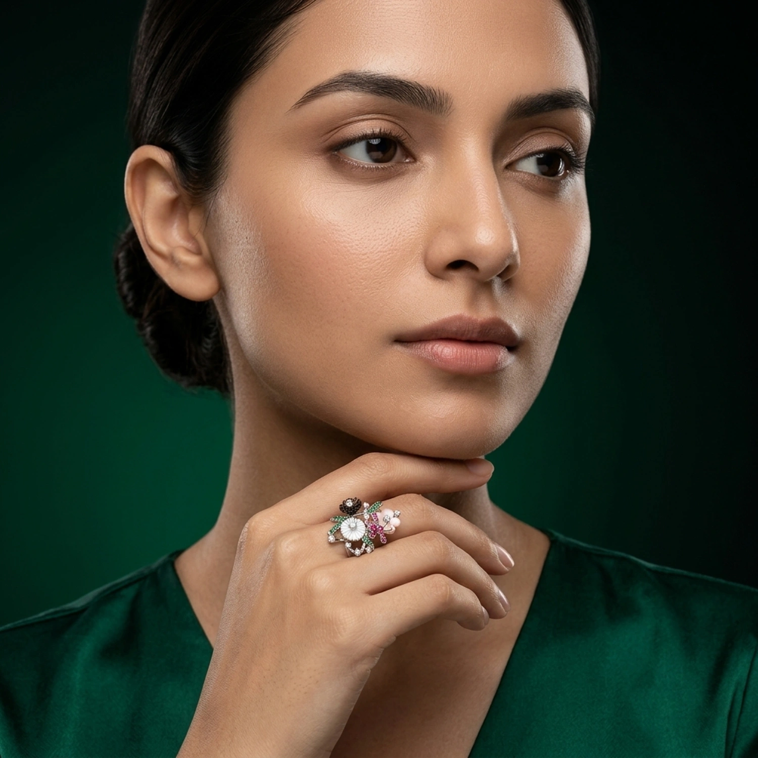 A luxurious 925 sterling silver floral cluster ring featuring pink, black, and white blooms with green gemstone accents. Styled in romantic nature-luxe elegance, this statement ring is perfect for weddings, galas, and special occasions.