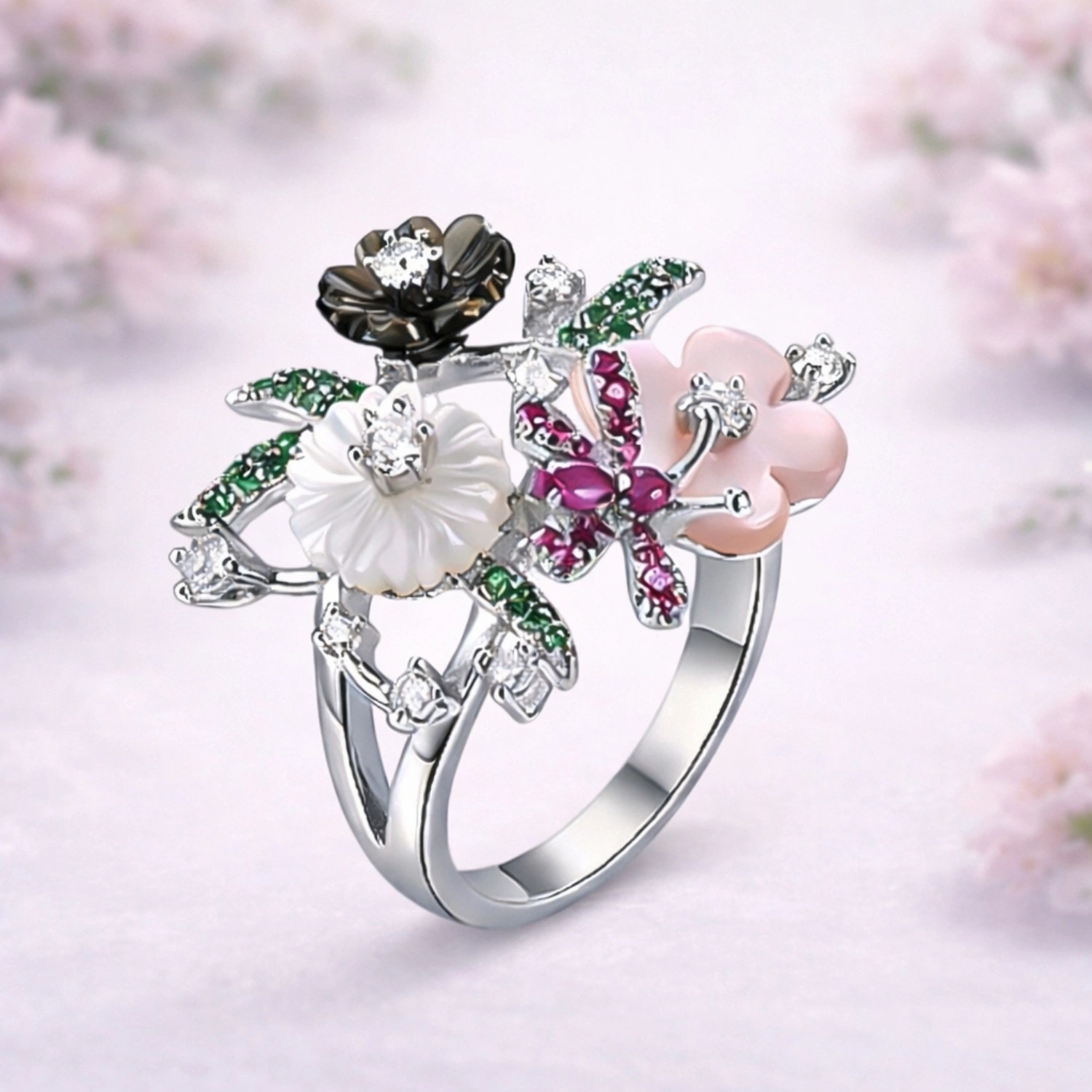 Crafted with delicate pink, black, and white mother-of-pearl style blooms, the design is enhanced by sparkling silver vine details and rich green gemstone accents that add depth and natural elegance. The layered floral arrangement creates a graceful cluster effect, making the ring feel both luxurious and expressive. Finished in premium 925 sterling silver with a high-shine rhodium coating, it offers brilliant sparkle, durability, and tarnish-resistant beauty for lasting wear.