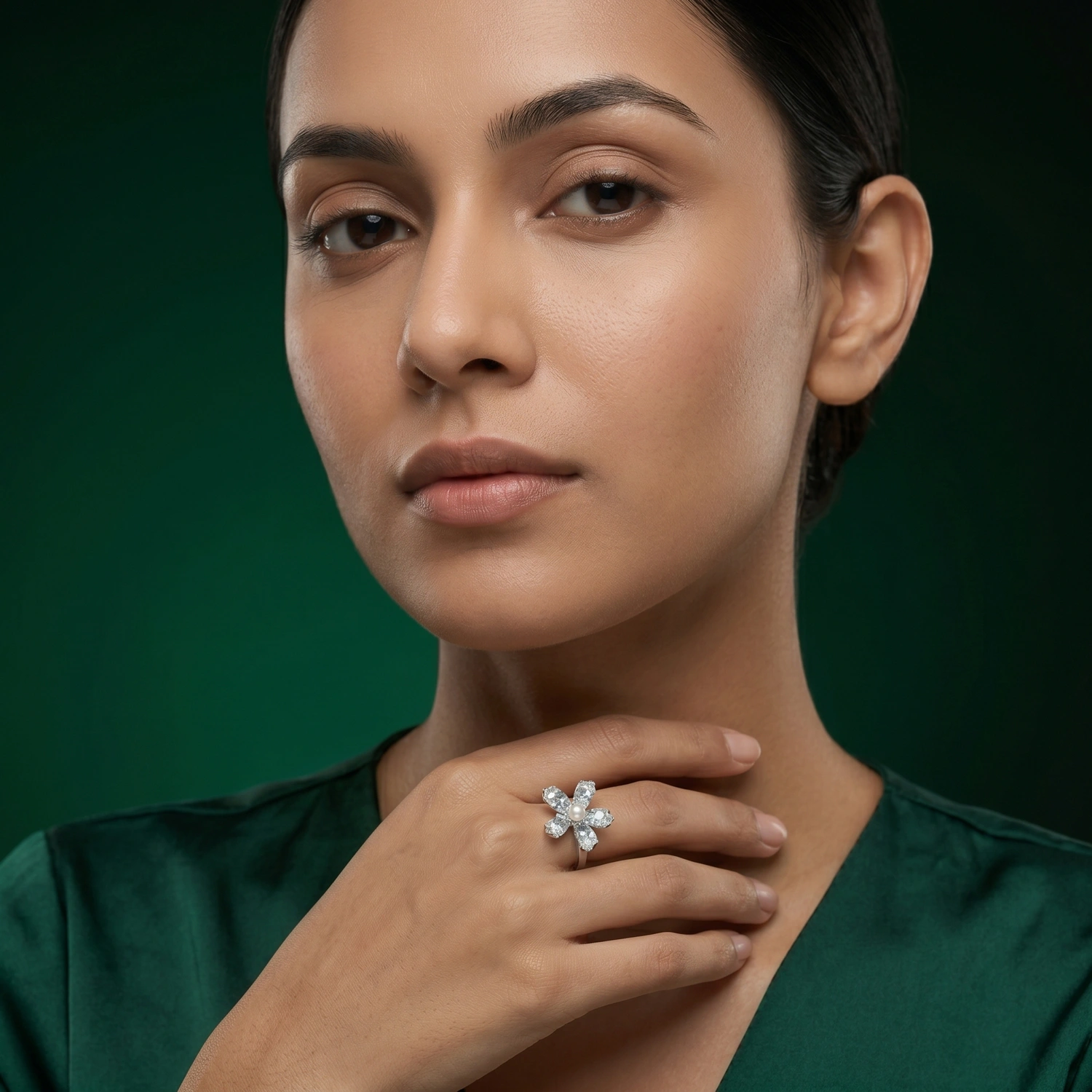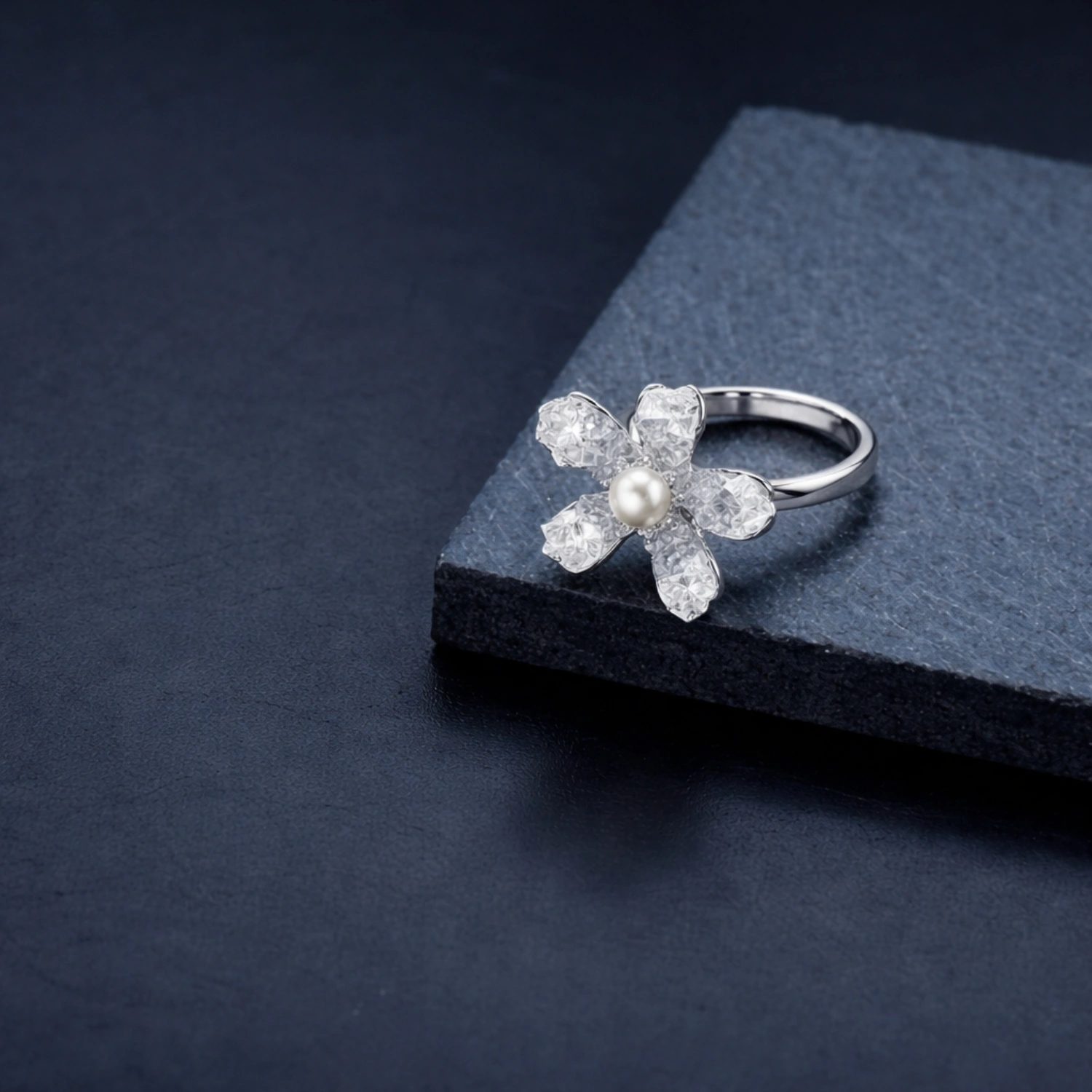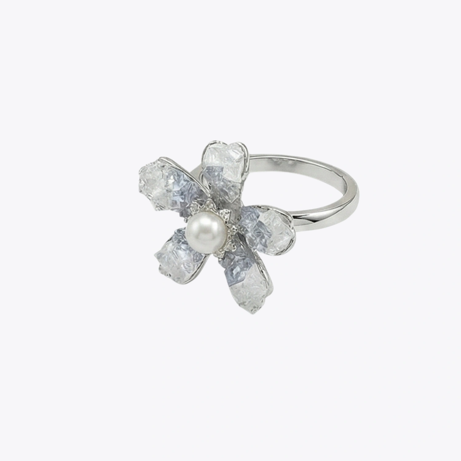 The intricate textured petals create a soft frosted shimmer that gives the floral design depth and artisanal beauty, while the centered freshwater pearl adds classic grace and refined luminosity. Crafted in premium 925 sterling silver, the ring is finished with a high-polish surface that contrasts beautifully against the frosted texture, enhancing every detail with luxurious brilliance. Its floral silhouette creates a delicate yet eye-catching presence, making it ideal for elegant daily wear or special occasion styling.
