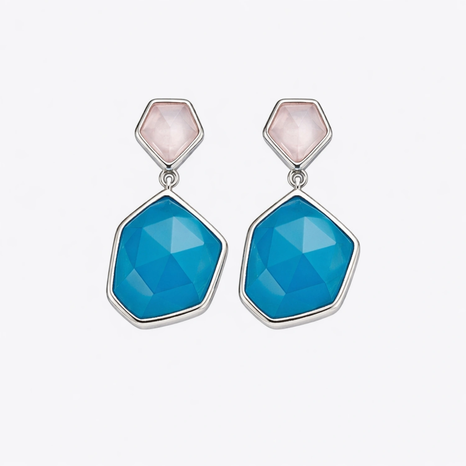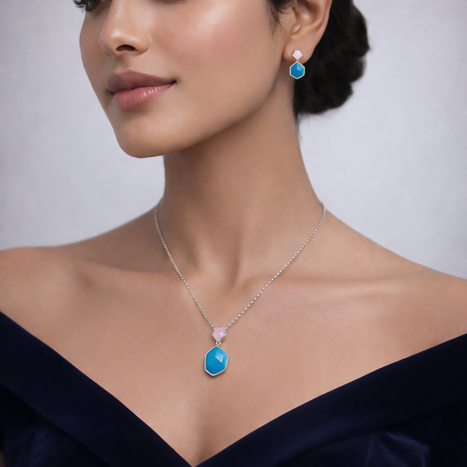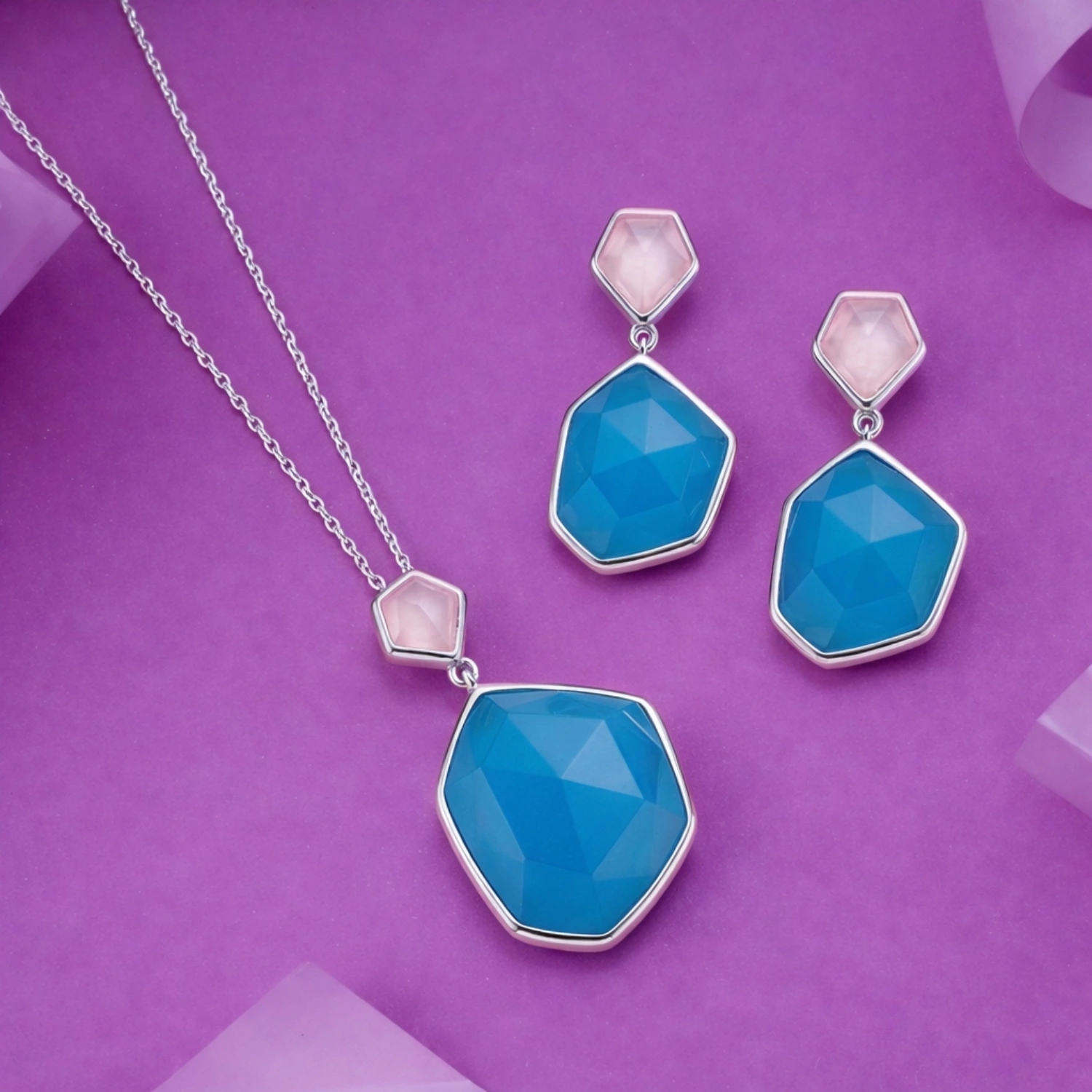 This contemporary pendant and earring set showcases a chic color-block design with bezel-set irregular geometric stones in contrasting blue and pink tones. The faceted blue gemstone creates a bold focal point, while the soft pink top stone adds a delicate feminine contrast.
