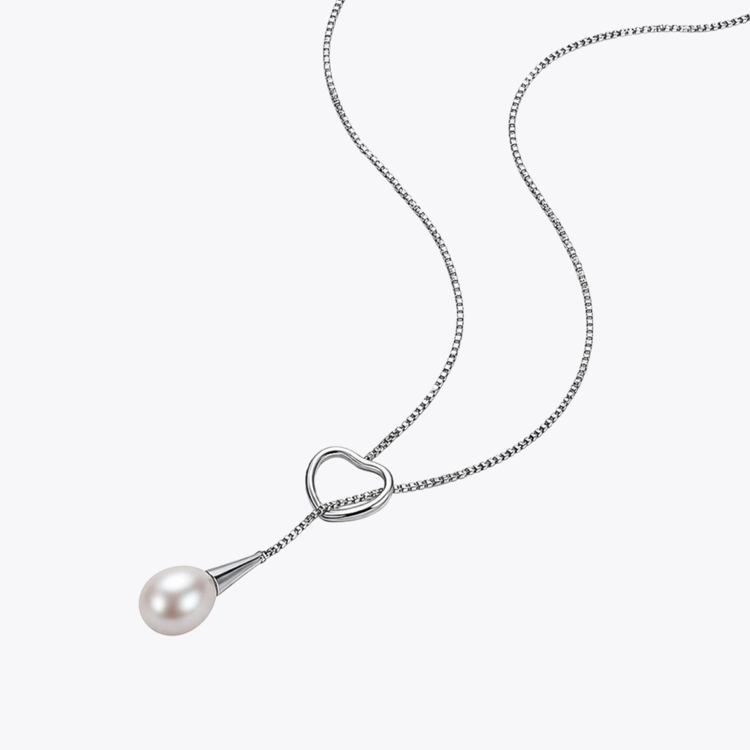 This elegant set features a polished open-heart motif through which the box chain glides, forming a graceful adjustable Y-drop silhouette. The luminous teardrop pearls add soft movement and timeless romantic beauty.