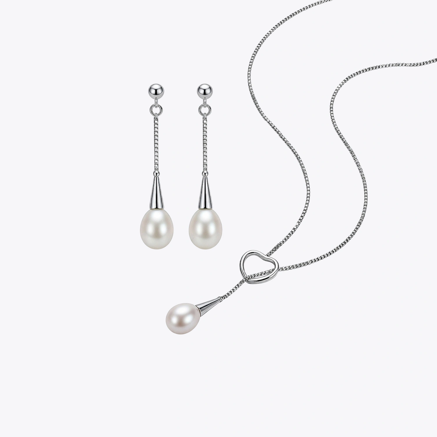 The necklace features a unique Y-drop design, where the chain slips through a polished open heart, creating an adjustable and beautifully fluid drape. This clever silhouette allows the vertical drop to sit elegantly against the neckline, enhancing both movement and sophistication. Matching chain-drop earrings mirror the graceful flow of the necklace, while the luminous teardrop pearls add timeless softness and romance. Finished in high-shine rhodium-plated 925 sterling silver, the set offers lasting brilliance and a mirror-bright glow.