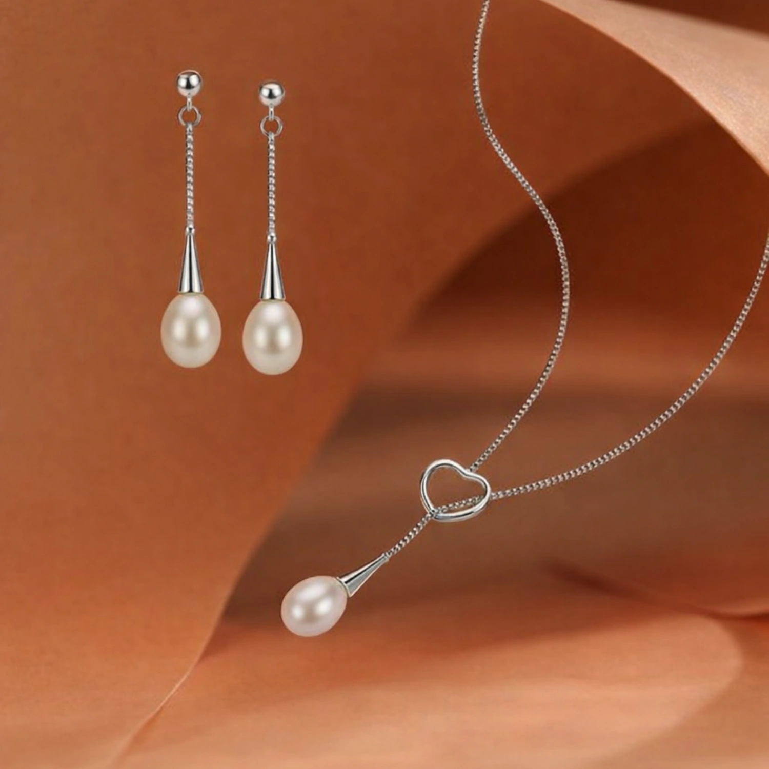 The Alencia Heart Lariat Pearl Drop Set is a romantic 925 sterling silver jewelry duo designed to capture effortless elegance with a modern love-inspired silhouette. Featuring a graceful lariat necklace and matching drop earrings, this set showcases lustrous teardrop pearls suspended from a delicate box chain for a fluid and feminine finish.