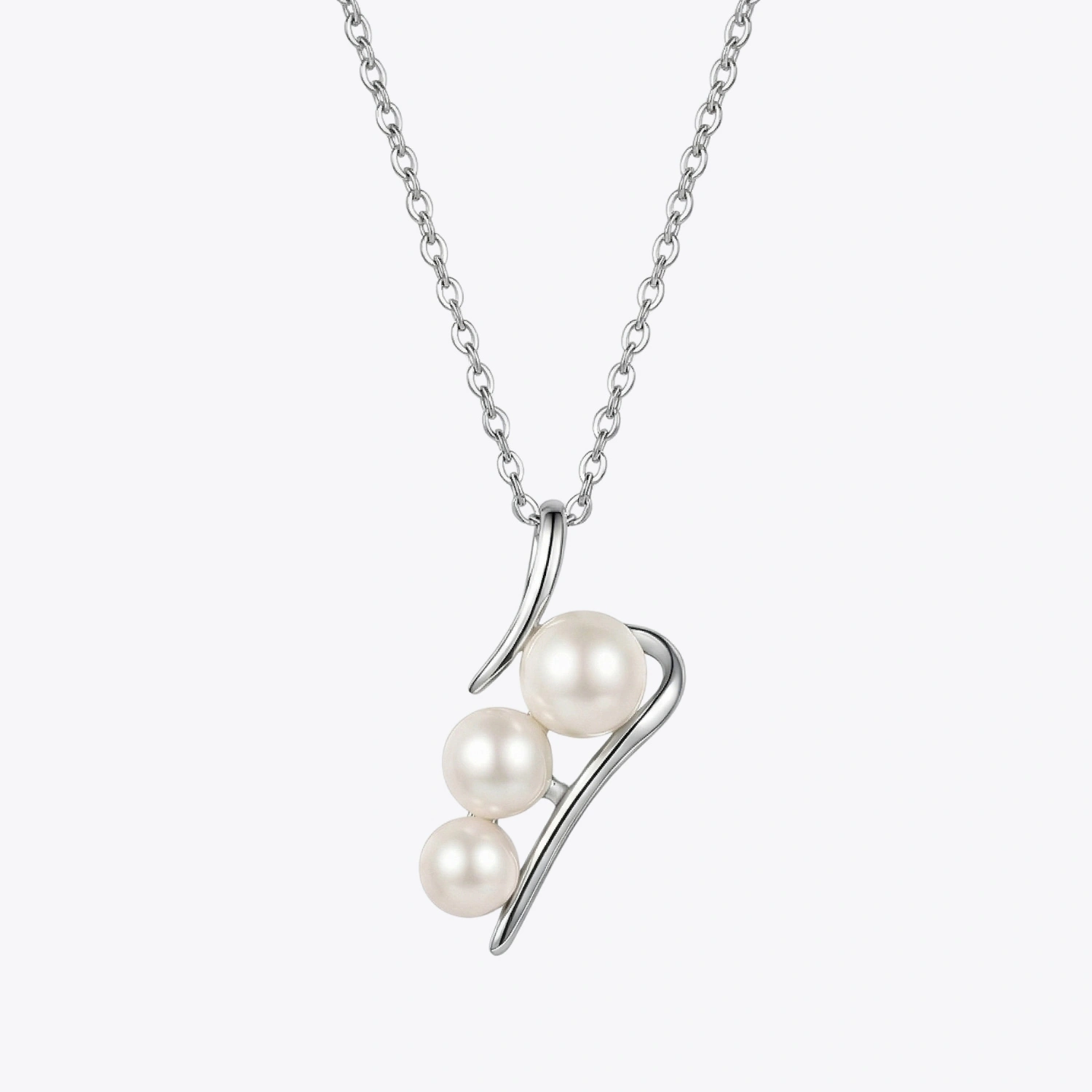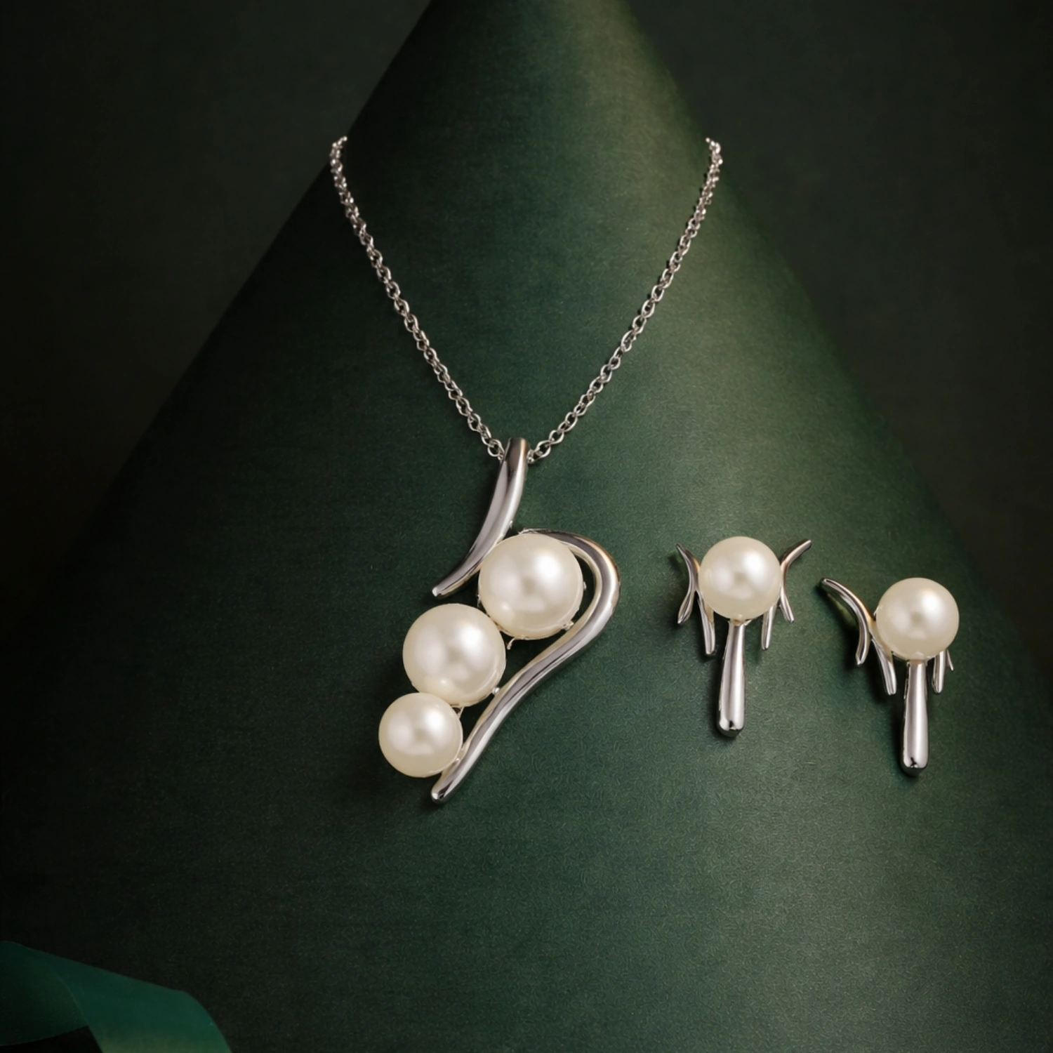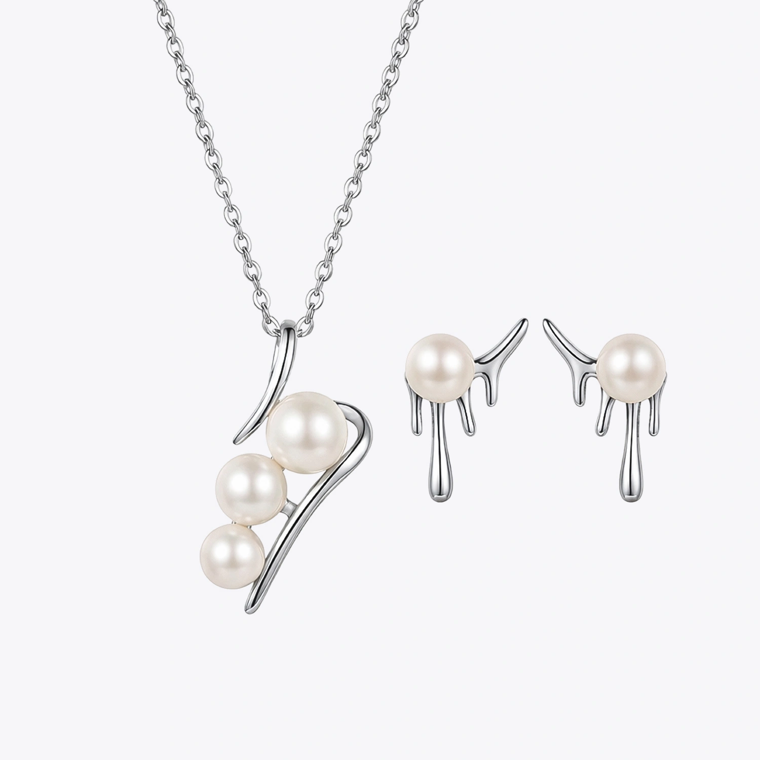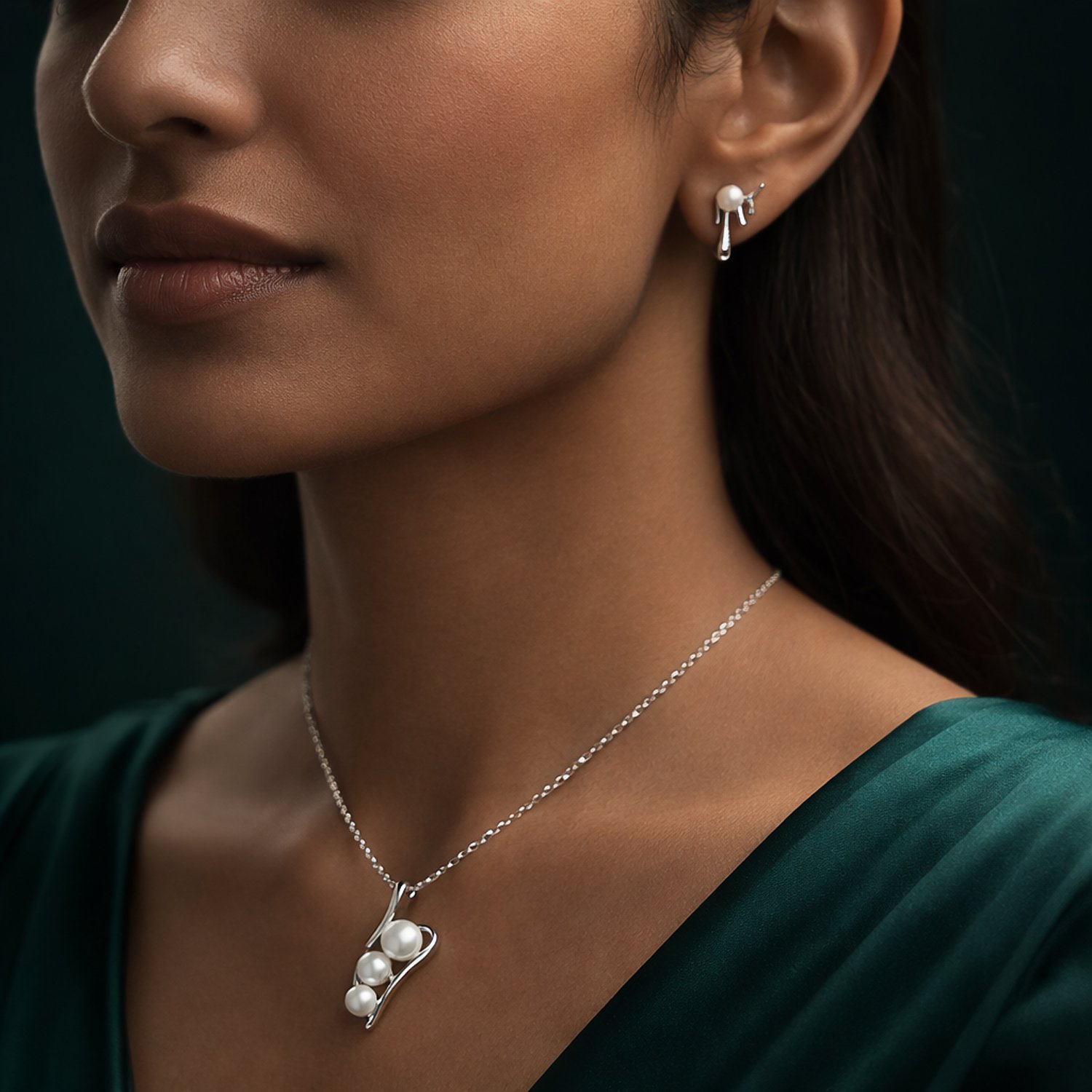 The pendant showcases a graceful trio of luminous pearls embraced by flowing organic silver curves, designed to mimic the movement of liquid metal in motion. The sculptural lines create depth, texture, and an artistic sense of movement, while the matching single-pearl “drip” earrings echo the same fluid design language for a beautifully coordinated finish. Crafted in premium 925 sterling silver with high-gloss rhodium plating, the set offers a realistic liquid-metal shine with mirror-like brilliance.