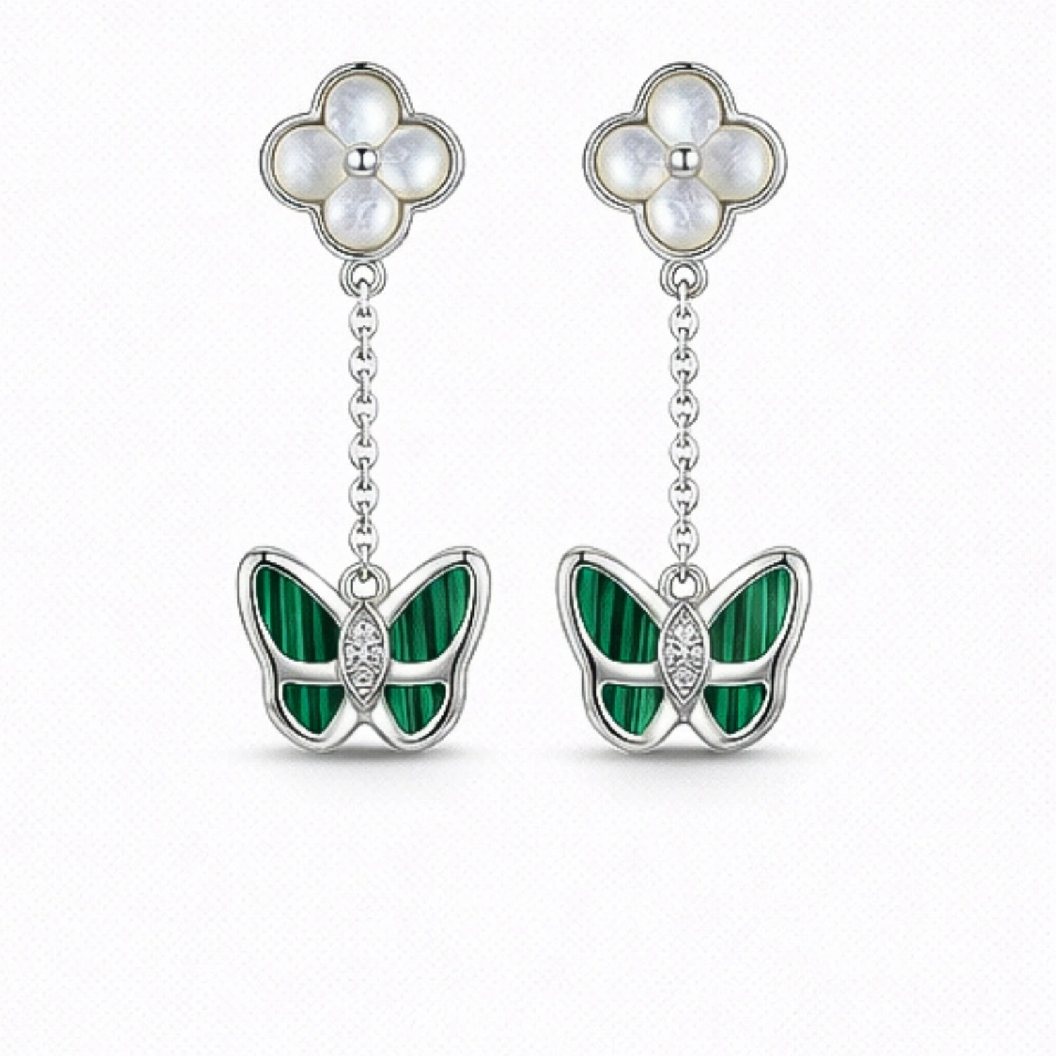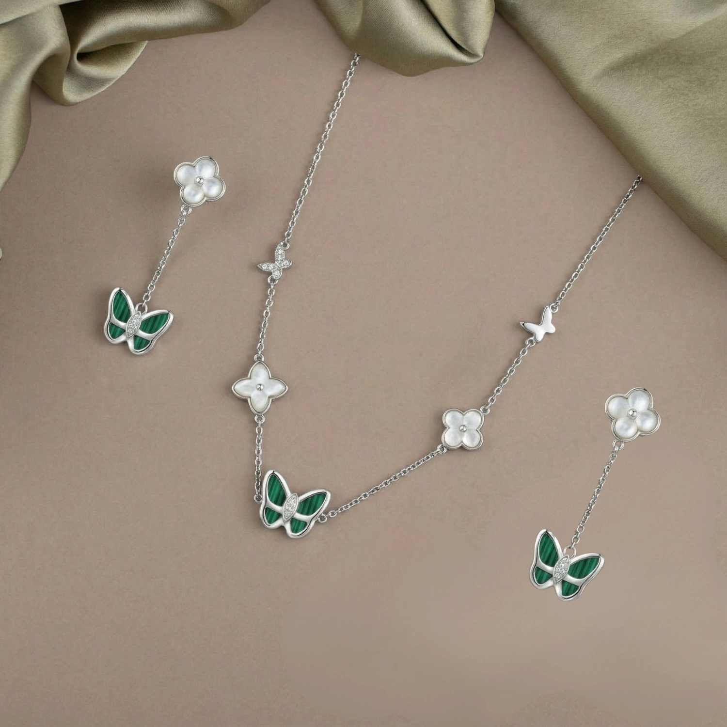 This elegant suite features a floral clover motif crafted with vivid green malachite petals, accented by sparkling cubic zirconia and smooth polished silver edges. The natural banding of the malachite gives each piece a unique gemstone character, while the clover shape adds symbolic beauty.