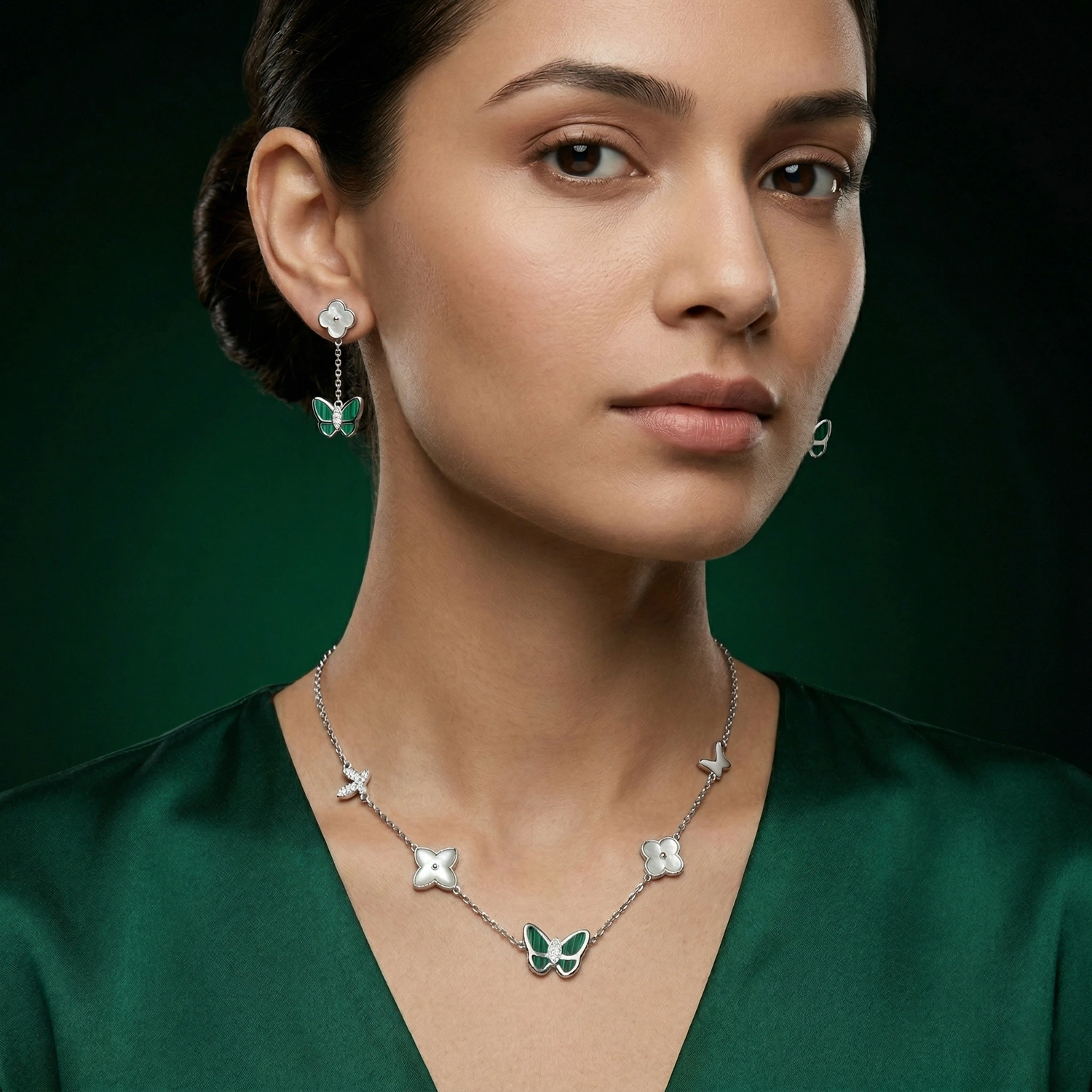 Pair this set with a crisp white shirt, black dress, emerald blouse, monochrome office wear, or elegant saree to let the vibrant green malachite stand out beautifully. Its sophisticated floral shape makes it perfect for both daywear and evening styling.