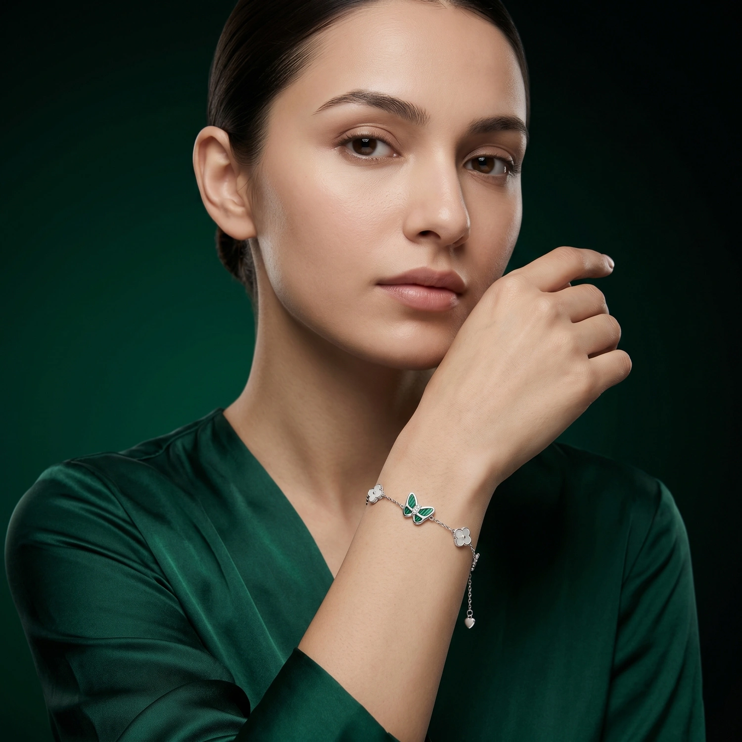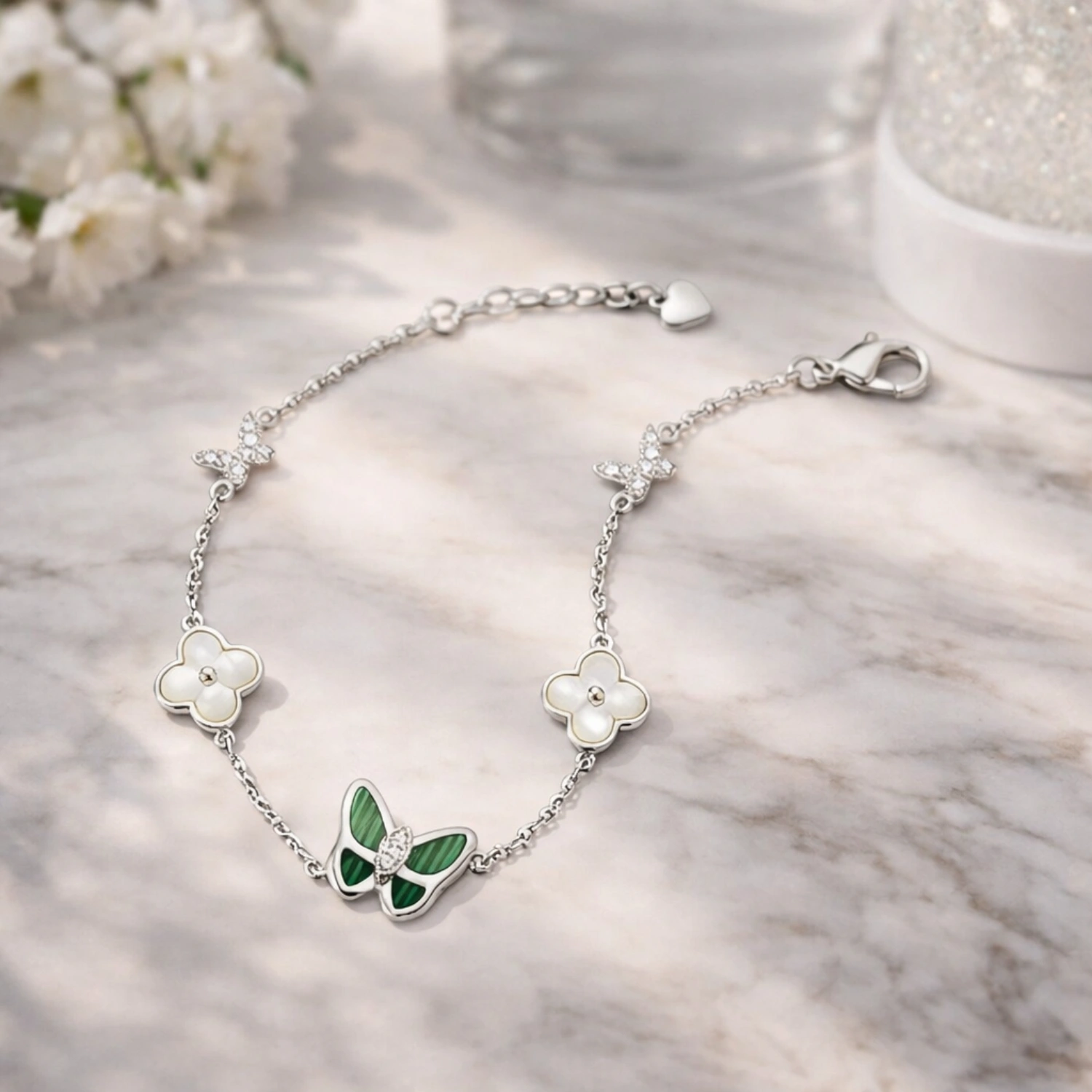 This elegant bracelet alternates between luminous white clover motifs and vibrant green malachite butterfly details, creating a beautifully balanced symbolic design. Cubic zirconia accents add delicate sparkle, while the polished silver structure enhances the whimsical luxury feel.
