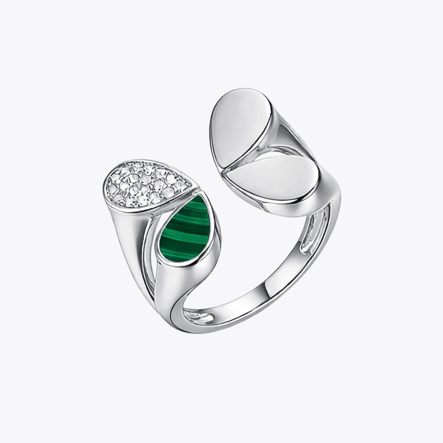 This ring showcases a delicate balance of nature-inspired elements, combining a finely crafted butterfly motif in rich green malachite tones with luminous mother-of-pearl clover accents. Each element is carefully set to create a layered, dimensional look that feels both whimsical and luxurious. Sparkling cubic zirconia stones are thoughtfully placed to enhance the design with subtle shimmer. The ring is finished on a high-polish rhodium-plated sterling silver base, ensuring durability, shine, and resistance to tarnish. The open adjustable band provides a comfortable and flexible fit for everyday wear.