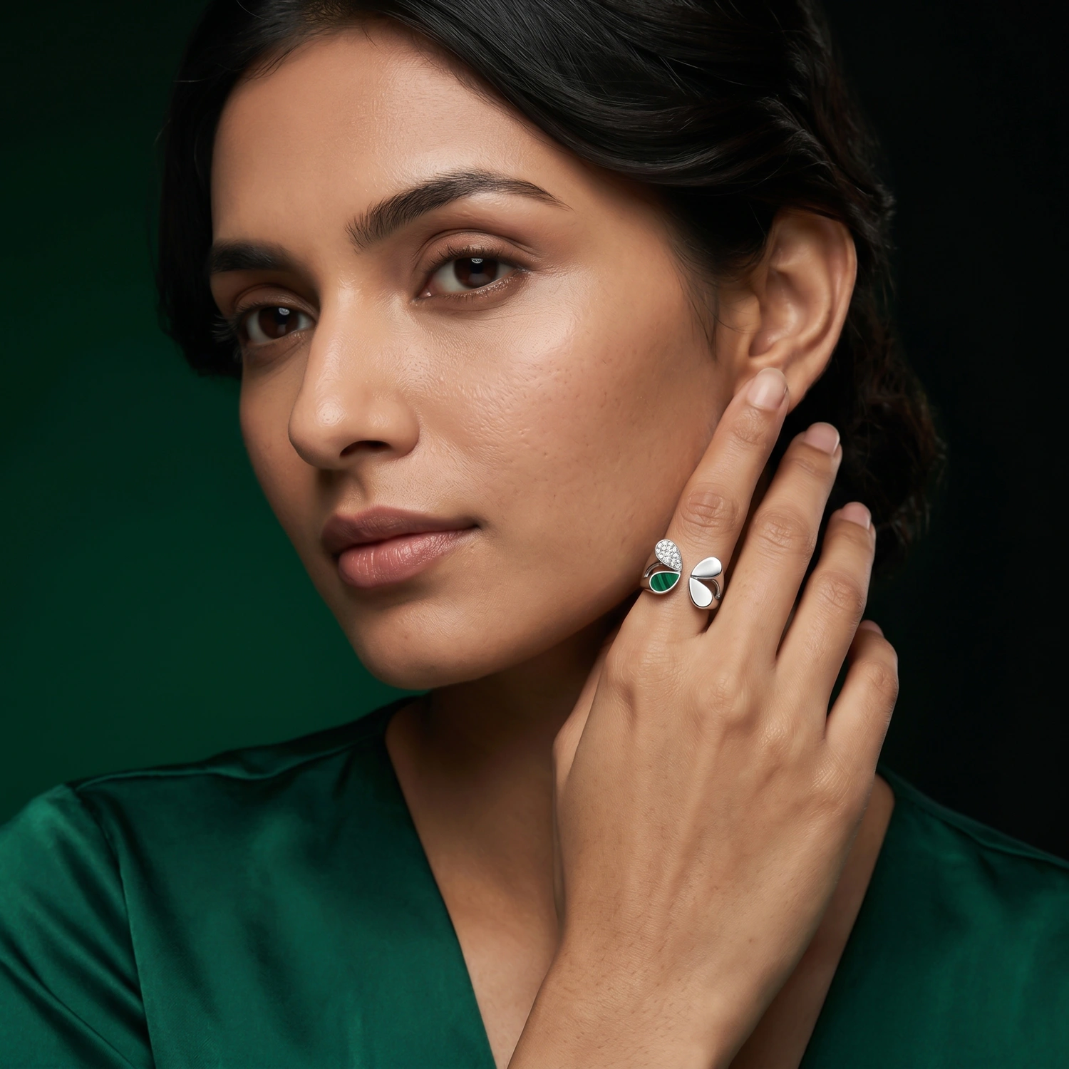 The Alencia Malachite Butterfly & Clover Ring is a luxurious nature-inspired piece crafted in premium 925 sterling silver, designed to reflect elegance, symbolism, and artistic craftsmanship. Featuring a graceful blend of vibrant green malachite butterfly detailing and iridescent mother-of-pearl clover motifs, this ring embodies the beauty of transformation and luck in a refined, wearable design. Sparkling cubic zirconia accents add a subtle brilliance, making it a truly enchanting statement piece.