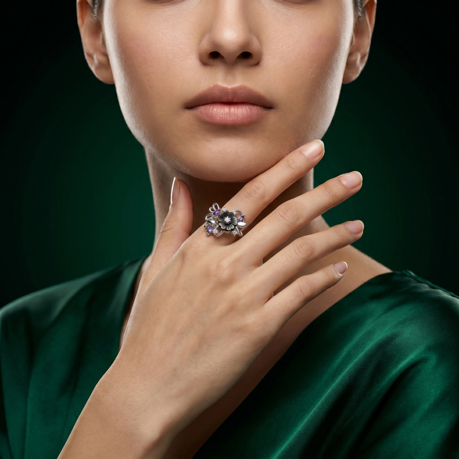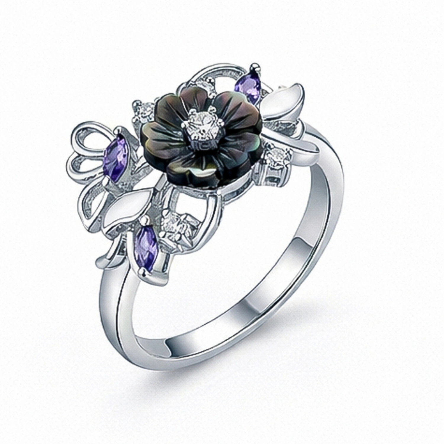 This ring showcases a beautifully sculpted floral centerpiece with deep black petals, enhanced by finely set clear cubic zirconia stones that add brilliance and contrast. Surrounding the floral design are elegant purple marquise-cut gems that bring a subtle pop of color and depth. The structure flows into delicate silver vine-like curves, creating a natural botanical feel. Crafted in high-quality sterling silver with rhodium plating, it ensures long-lasting shine, durability, and resistance to tarnish.