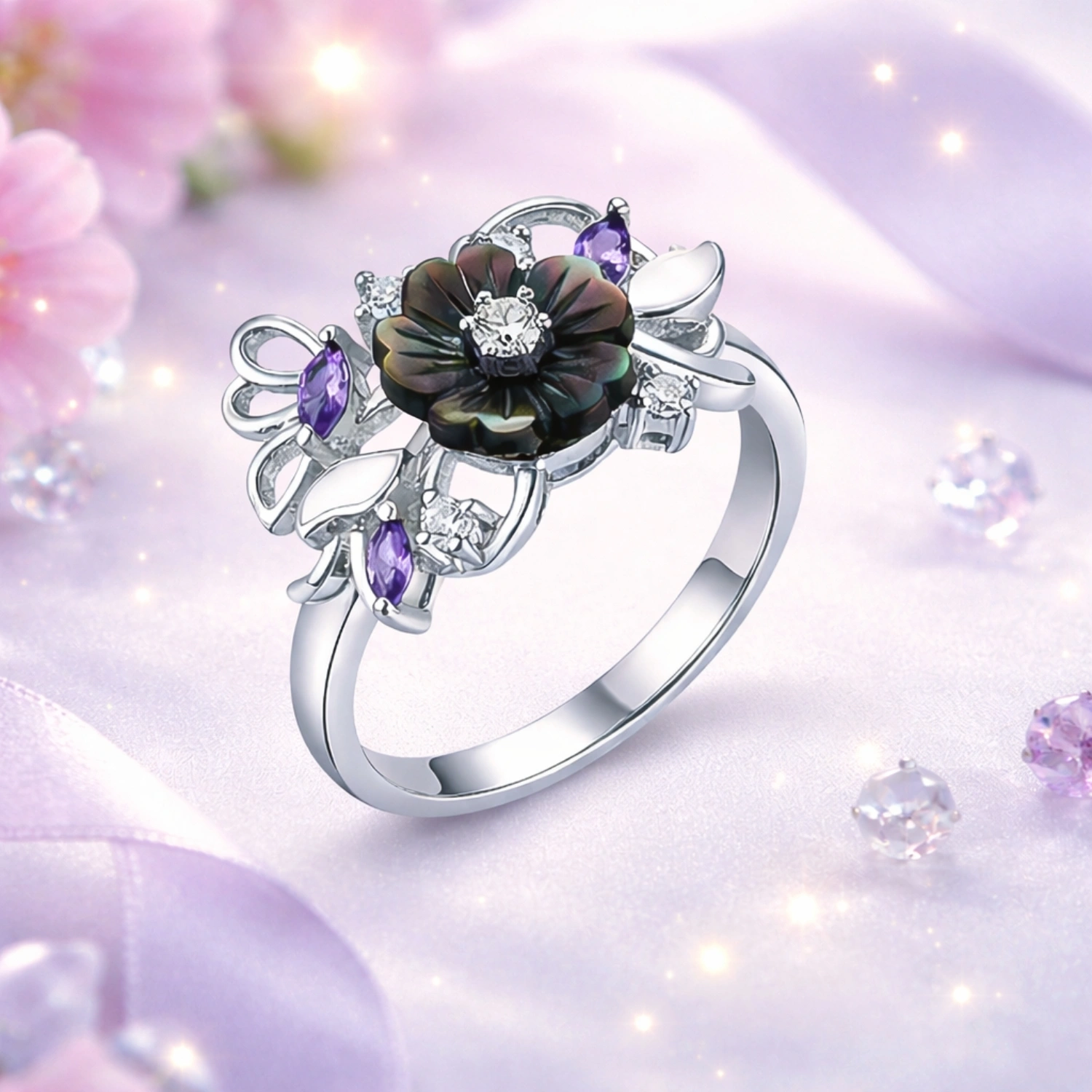 The Alencia Midnight Bloom Ring is a striking piece crafted in genuine 925 sterling silver, inspired by the elegance of dark blooming florals under a moonlit sky. Featuring a sculpted black floral motif accented with sparkling clear stones and delicate purple marquise gems, this ring captures a perfect balance of mystery, sophistication, and modern floral artistry. Designed to stand out while maintaining elegance, it is a statement accessory for refined styling.