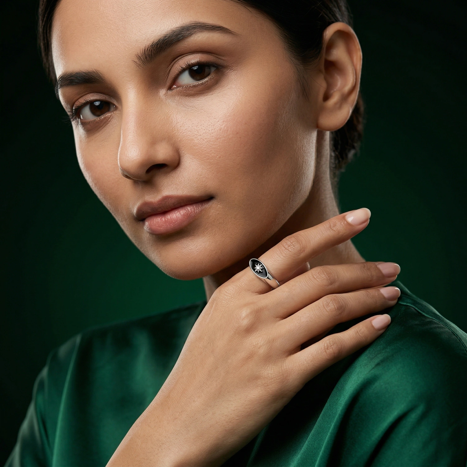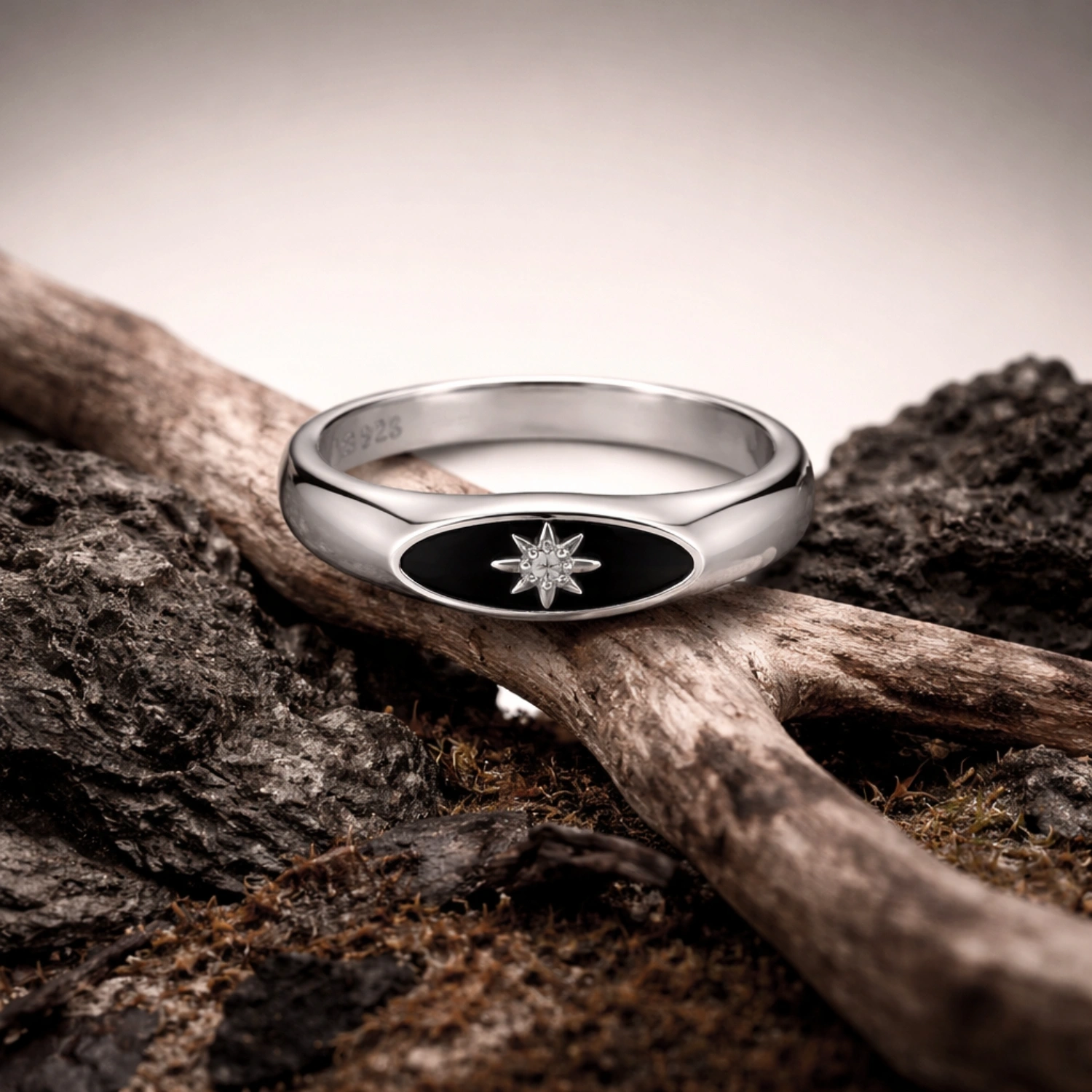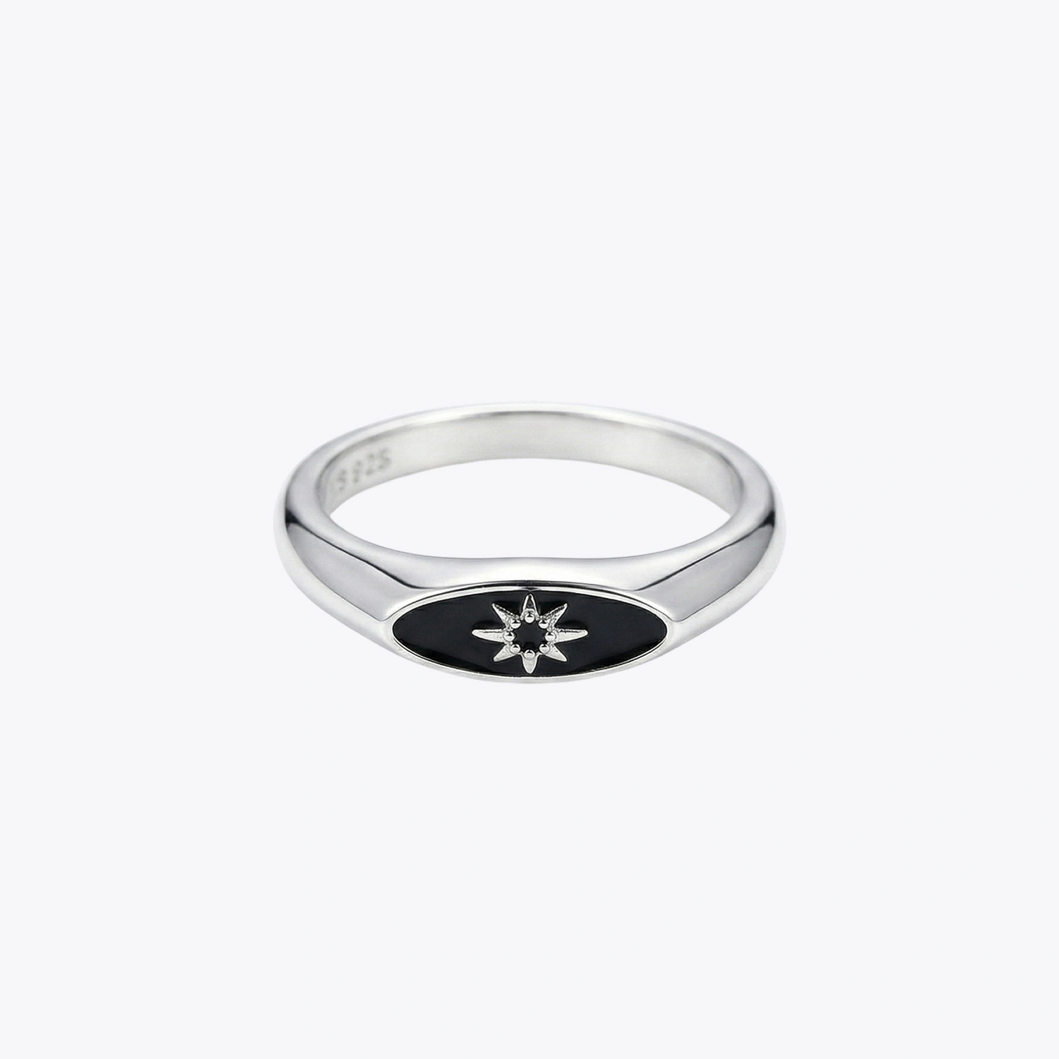 The Alencia Midnight Star Signet Ring is a sleek 925 sterling silver piece featuring a glossy black oval inlay highlighted with a delicate silver starburst for a modern celestial touch.