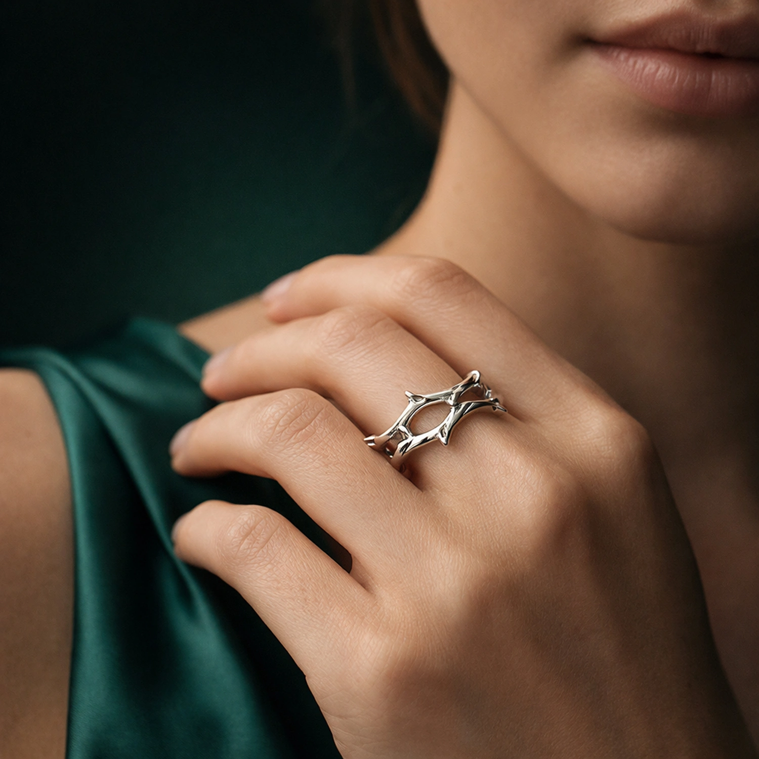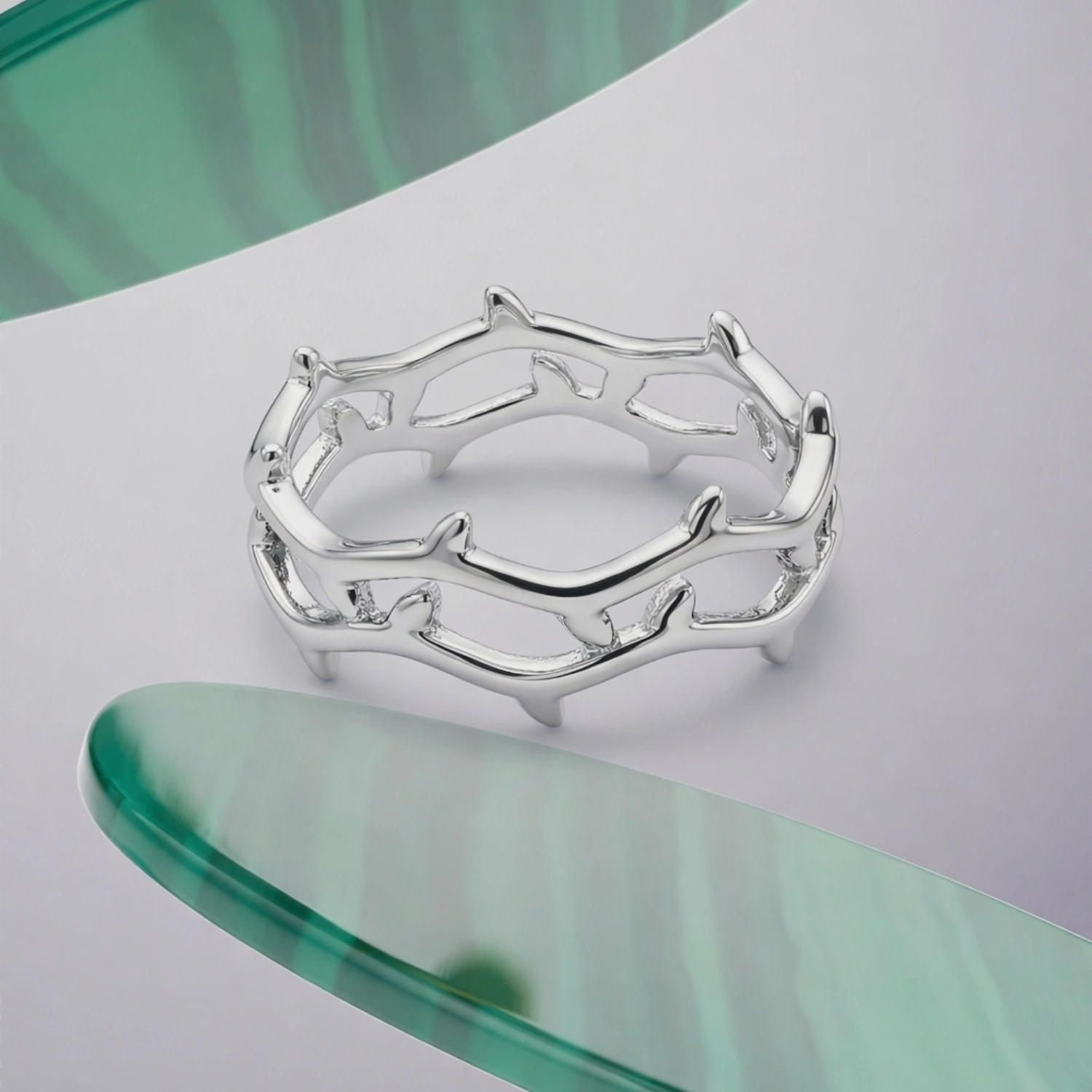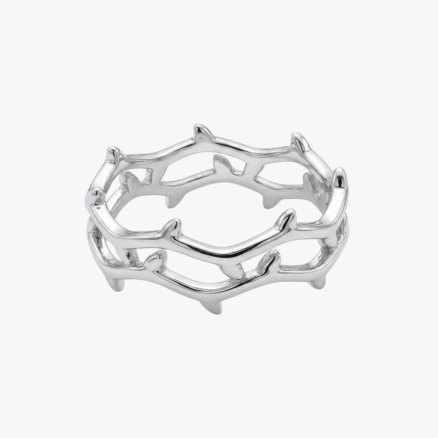 Its structured outer edge adds a unique dimension to the classic silver band, making it an ideal choice for those who appreciate subtle sophistication and modern design aesthetics. Whether worn as a standalone statement or stacked with other rings, this band brings effortless elegance to everyday styling.