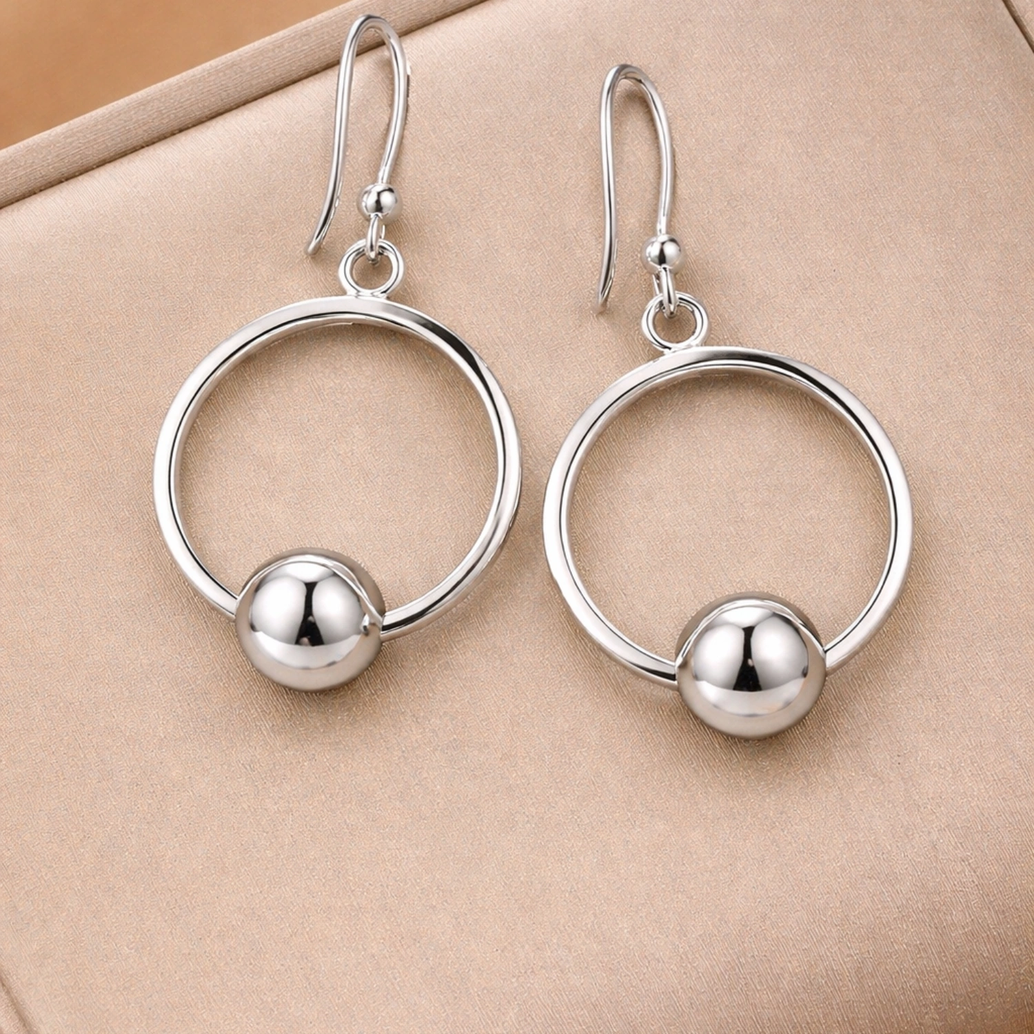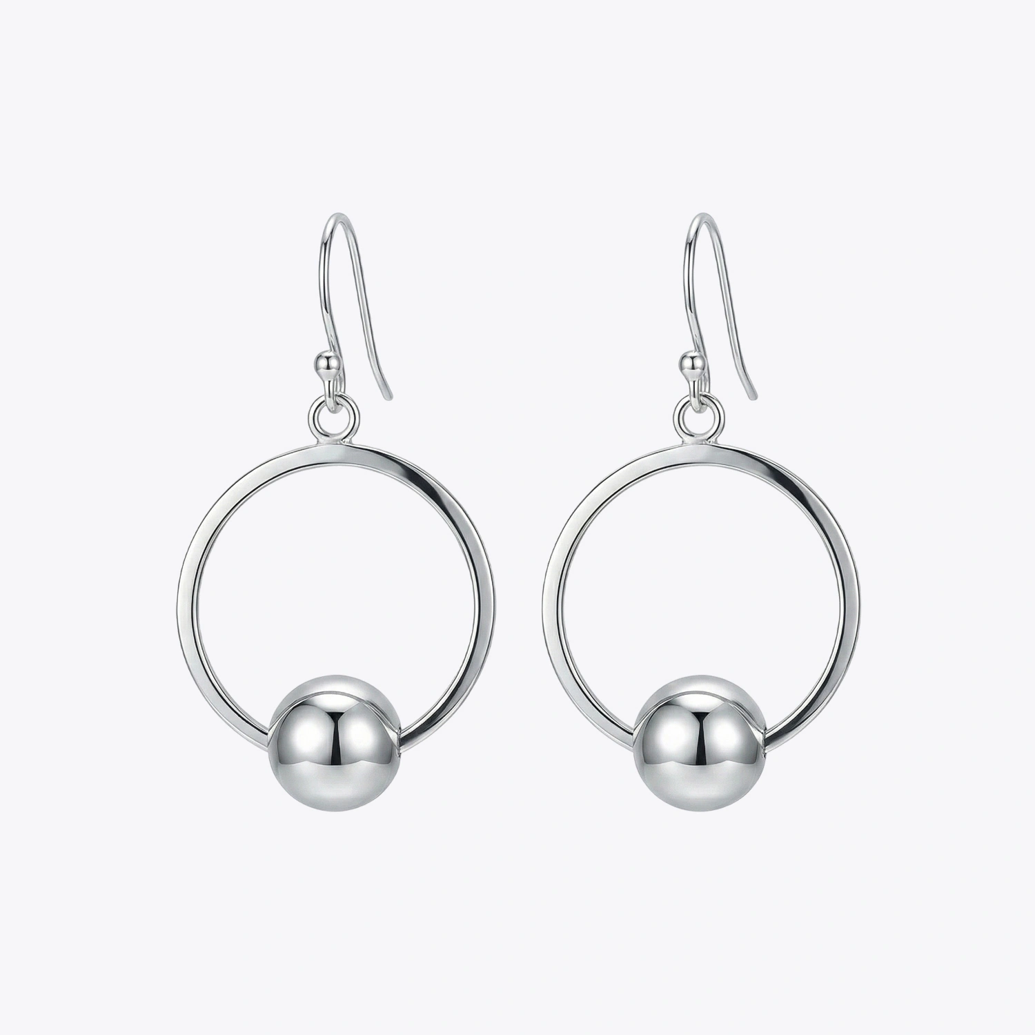 Sleek and modern, these earrings feature a high-polish silver bead suspended within a delicate geometric hoop for a sophisticated look.