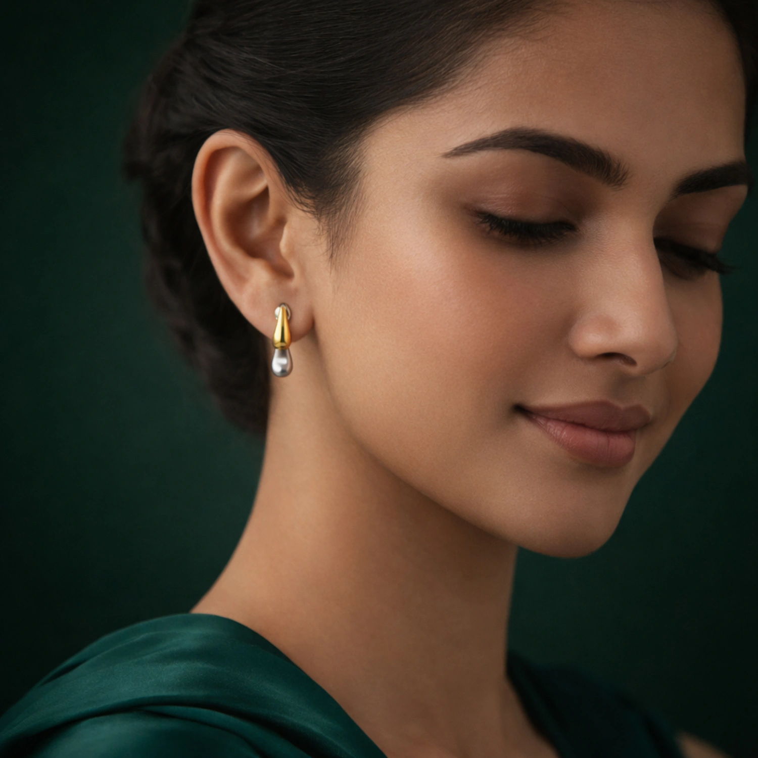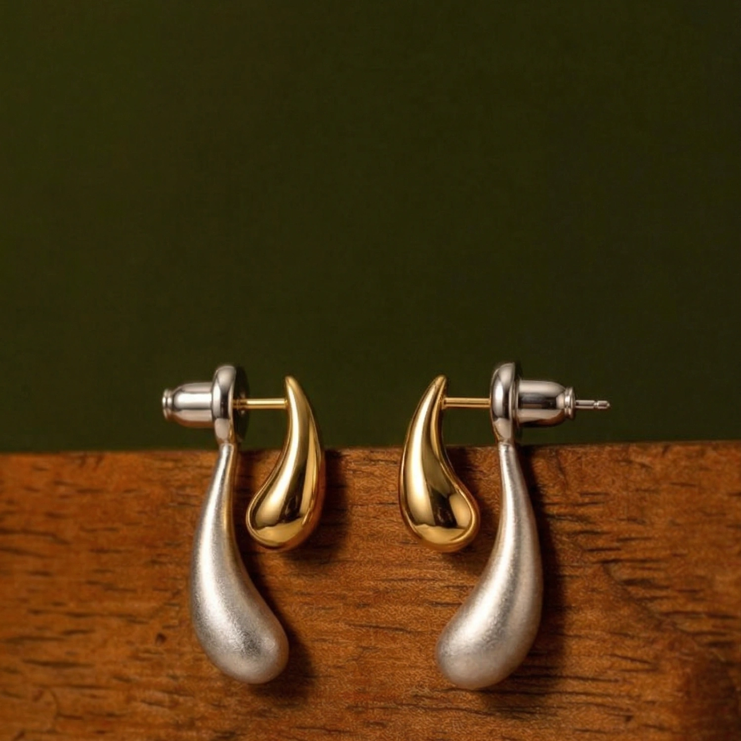 The Aura Two-Tone Teardrop Studs are elegant 925 sterling silver earrings featuring a stacked teardrop design with a refined contrast of gold and silver finishes.