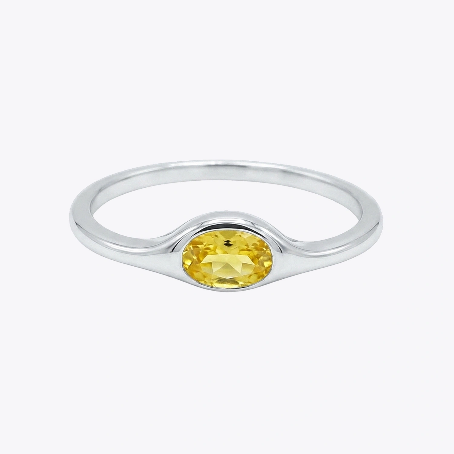 A slender and elegant 925 silver band featuring a vibrant, horizontally set oval yellow gemstone.
