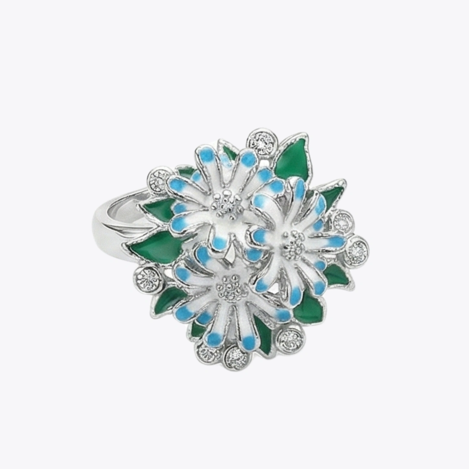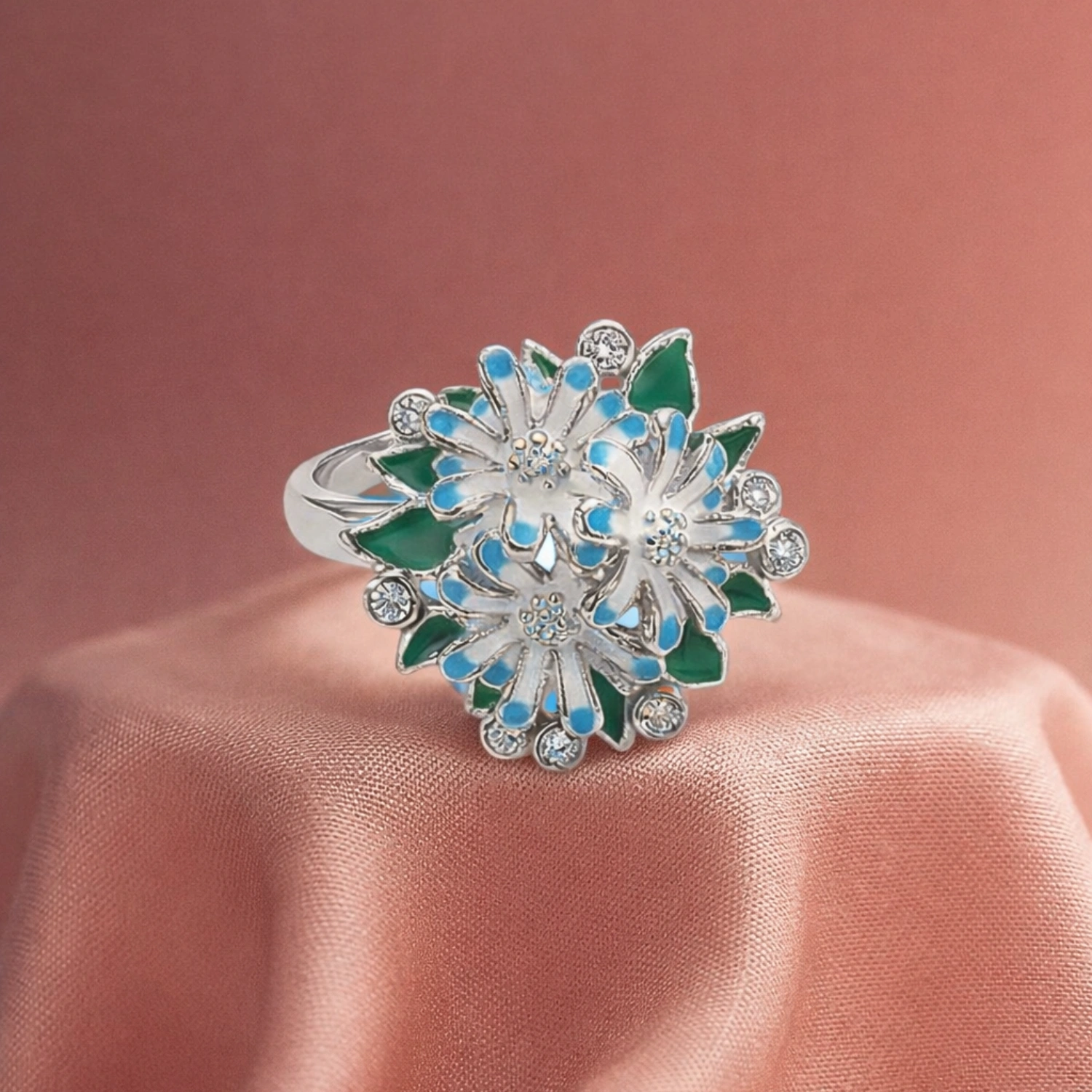The Azure Bloom Enamel Ring is a beautifully handcrafted piece made in premium 925 sterling silver, designed to capture the freshness of spring blossoms. Featuring a vibrant layered daisy motif with hand-painted enamel detailing, this ring combines artistic charm with elegant craftsmanship. The delicate white petals with blue-tipped edges and soft green accents create a lively floral expression, making it a perfect cheerful statement accessory.