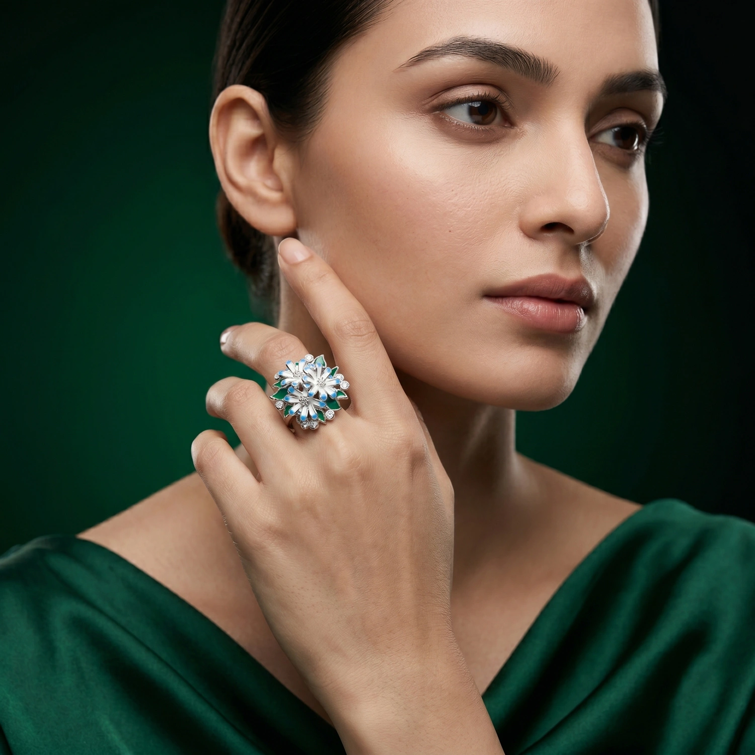 The Azure Bloom Enamel Ring pairs beautifully with light, casual, and summer-inspired outfits. It complements white sundresses, denim looks, floral prints, and pastel-toned ensembles effortlessly. Its colorful floral design makes it a perfect everyday statement piece that adds a cheerful and refreshing touch to simple outfits while also blending well with other nature-inspired jewelry.