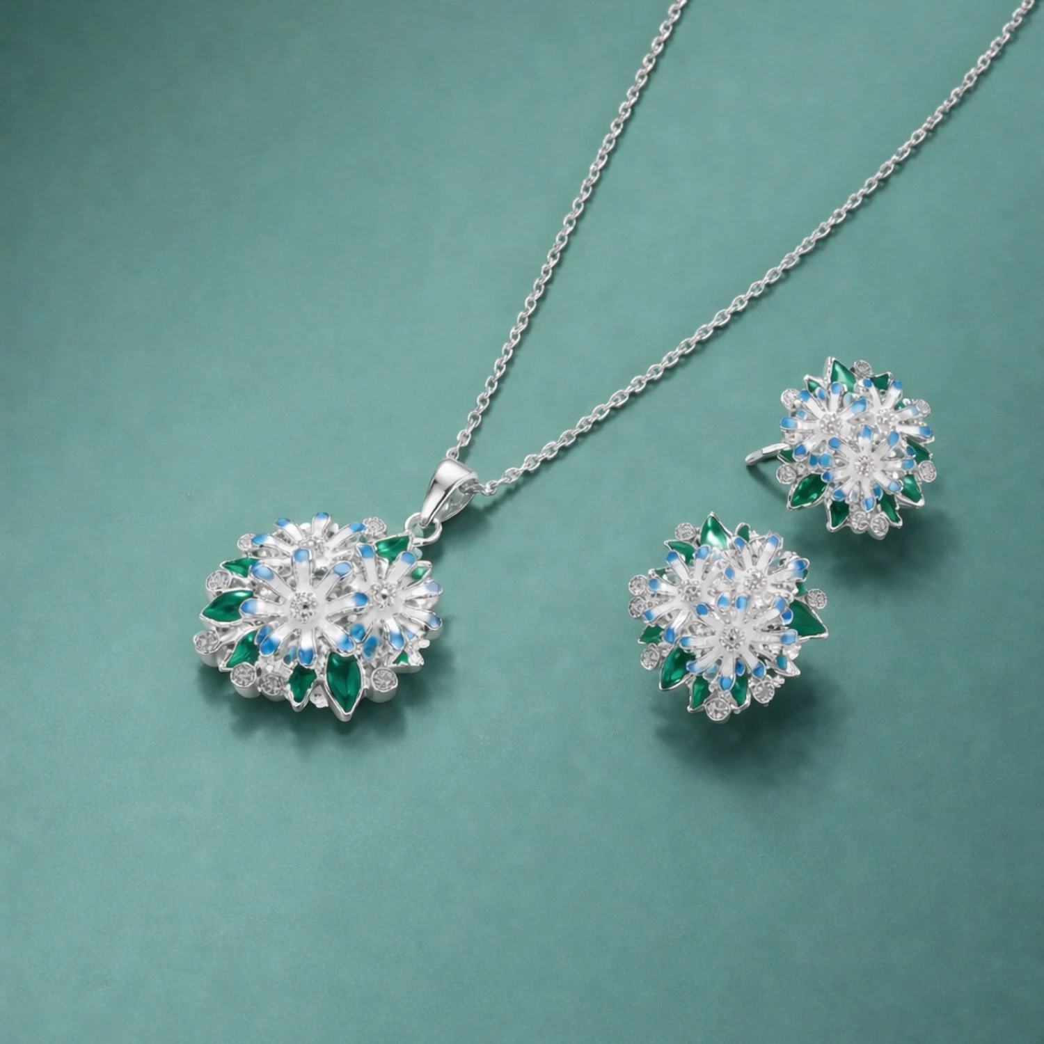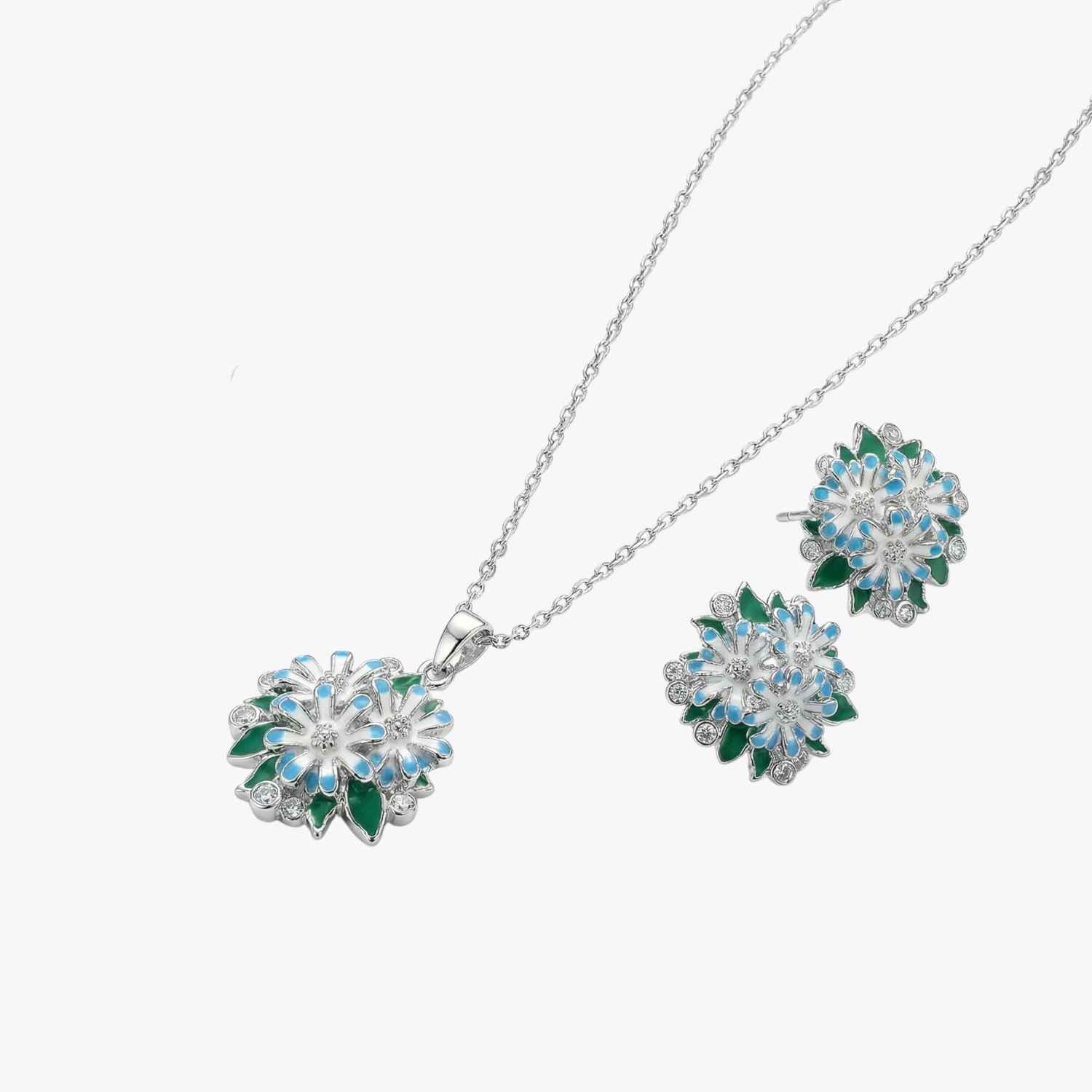The Azure Bloom Enamel Set is a vibrant 925 sterling silver jewelry collection inspired by the cheerful beauty of blooming daisies. Featuring layered floral motifs with hand-painted enamel, sparkling cubic zirconia centers, and delicate green leaf accents, this set brings together whimsical charm and botanical sophistication.