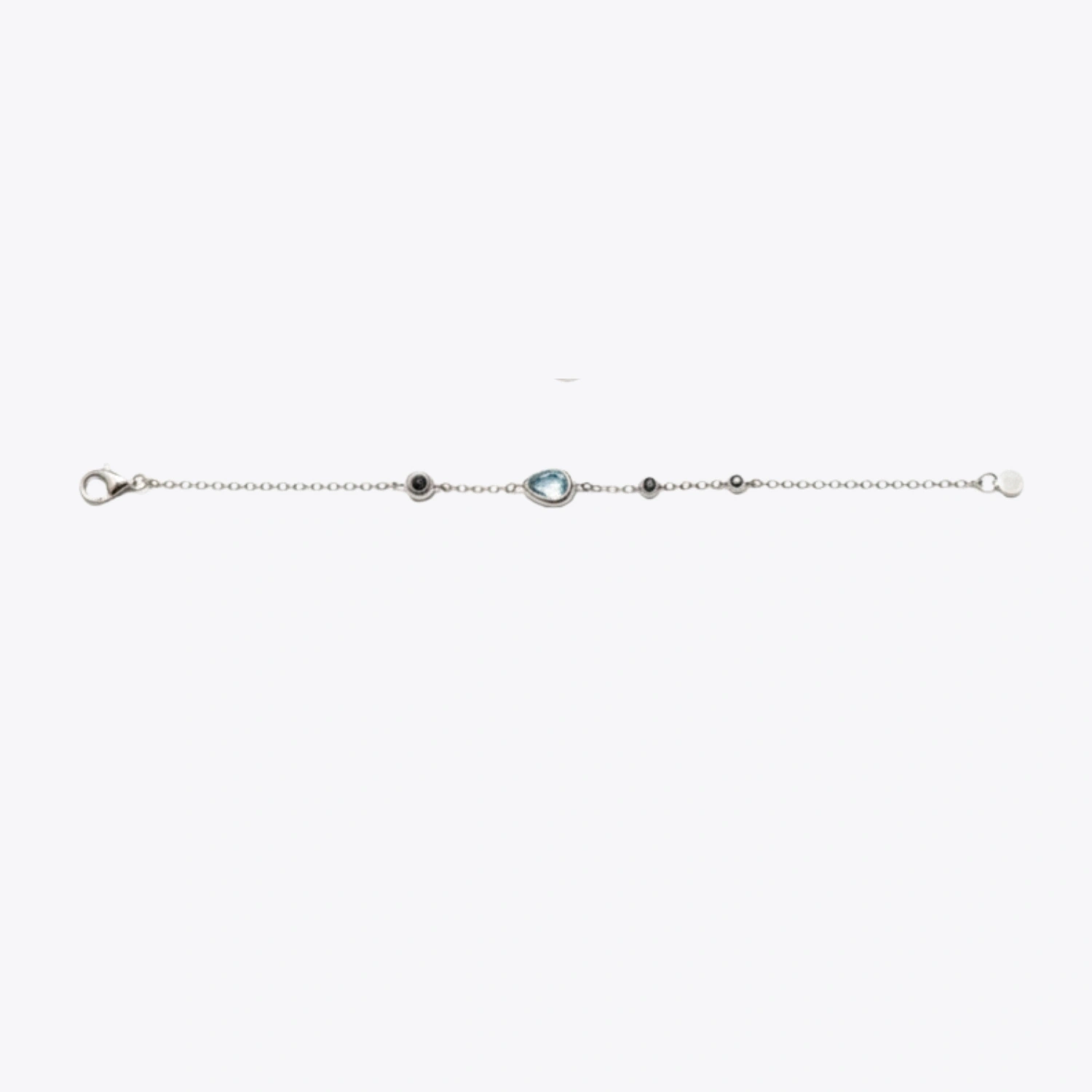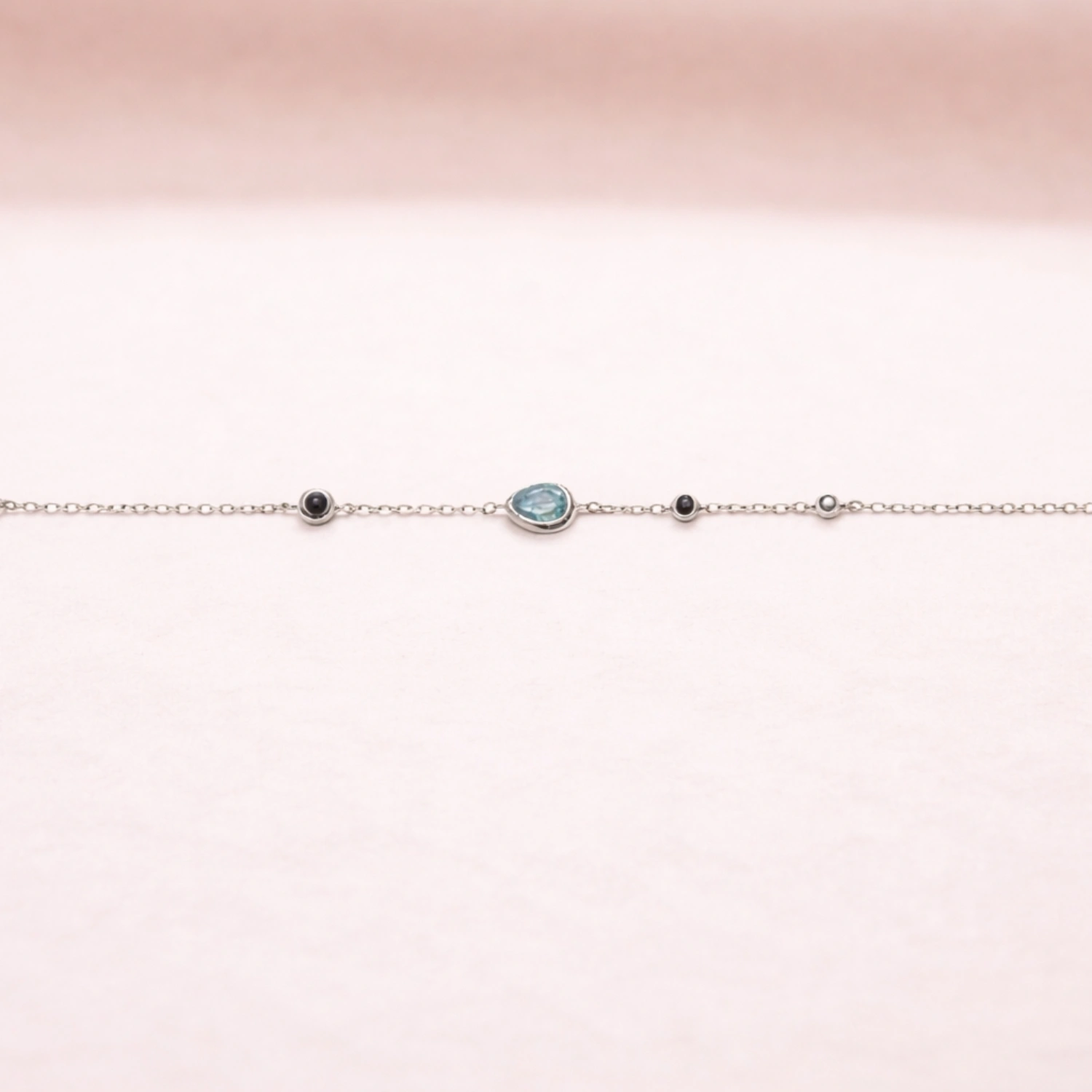 This bracelet features a finely balanced station design, where soft light blue teardrop stones are spaced elegantly along the chain and contrasted with deep circular accents for a celestial-inspired effect. The asymmetrical arrangement creates a modern artistic flow, while the polished 925 sterling silver base enhances the brilliance of the stone inlays. Lightweight yet luxurious, the bracelet is designed for comfort and durability, offering a secure fit with its adjustable closure.