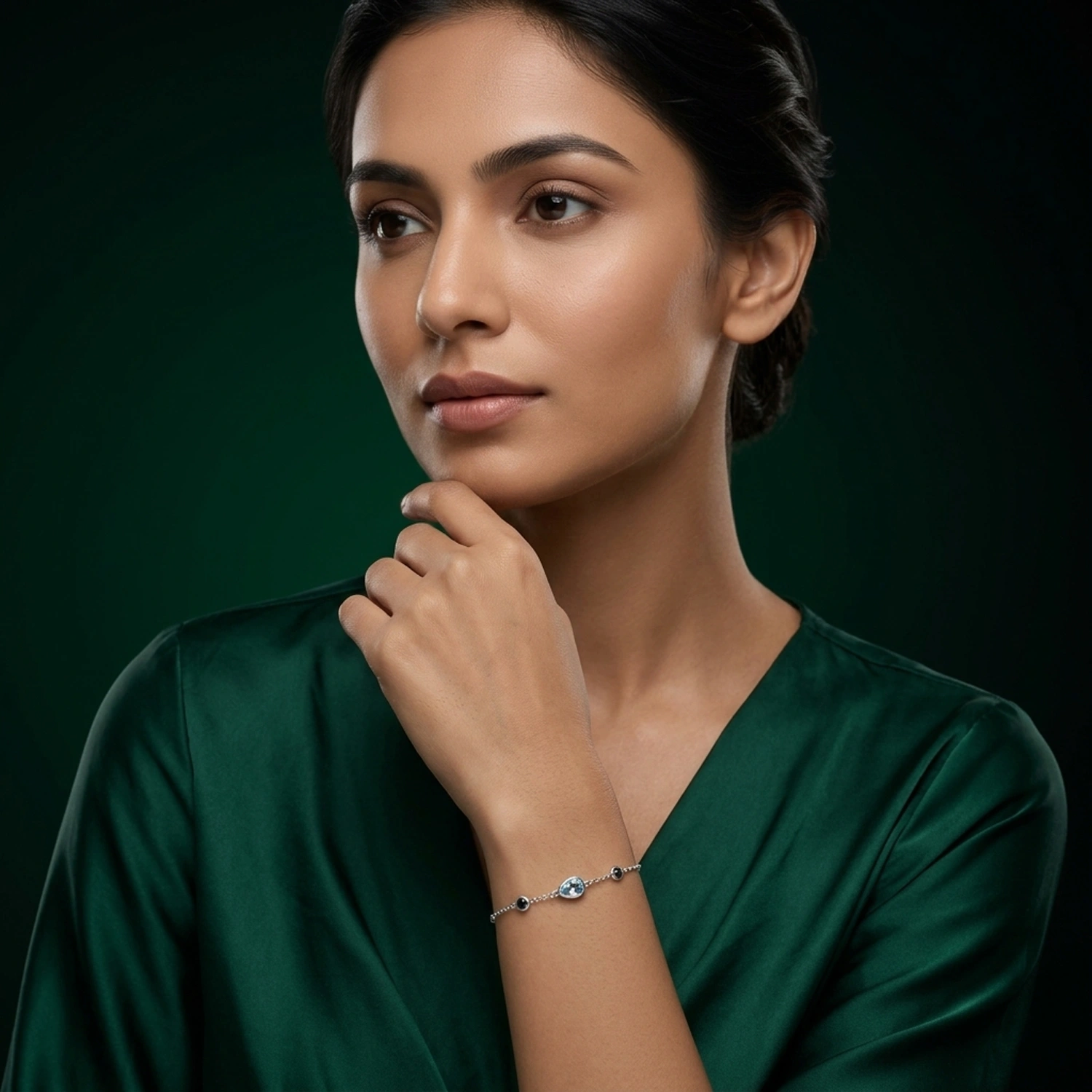 The Azure Teardrop Celestial Bracelet pairs beautifully with evening gowns, deep V-neck dresses, satin tops, or elegant monochrome outfits. Its soft blue tones and celestial detailing make it ideal for weddings, formal dinners, and upscale occasions. It can be worn alone for a refined statement or layered with delicate silver chains for a chic contemporary look.
