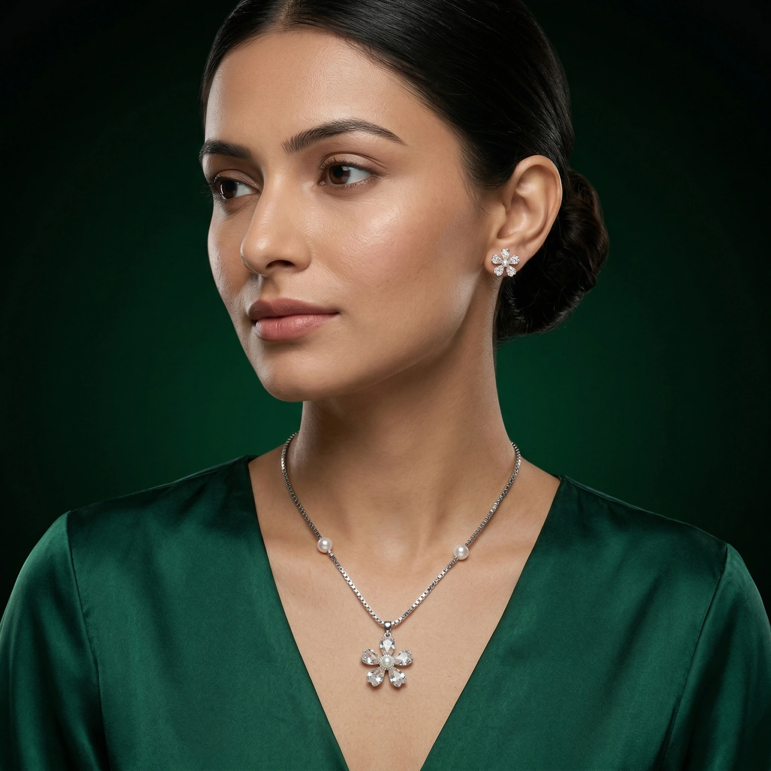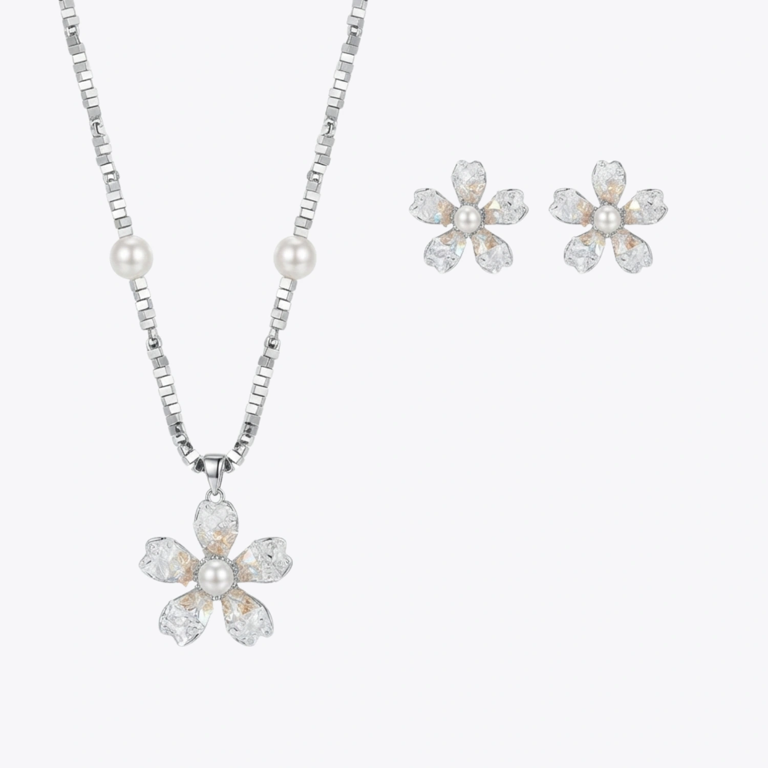 Expertly crafted from premium 925 sterling silver, the design showcases sparkling floral petals that capture light beautifully, paired with delicate pearl details that add softness and classic charm. The modern square-link chain introduces a contemporary touch, perfectly balancing timeless floral inspiration with polished modern elegance. Finished in premium high-polish rhodium plating, the set offers a tarnish-resistant mirror-like glow and long-lasting brilliance.
