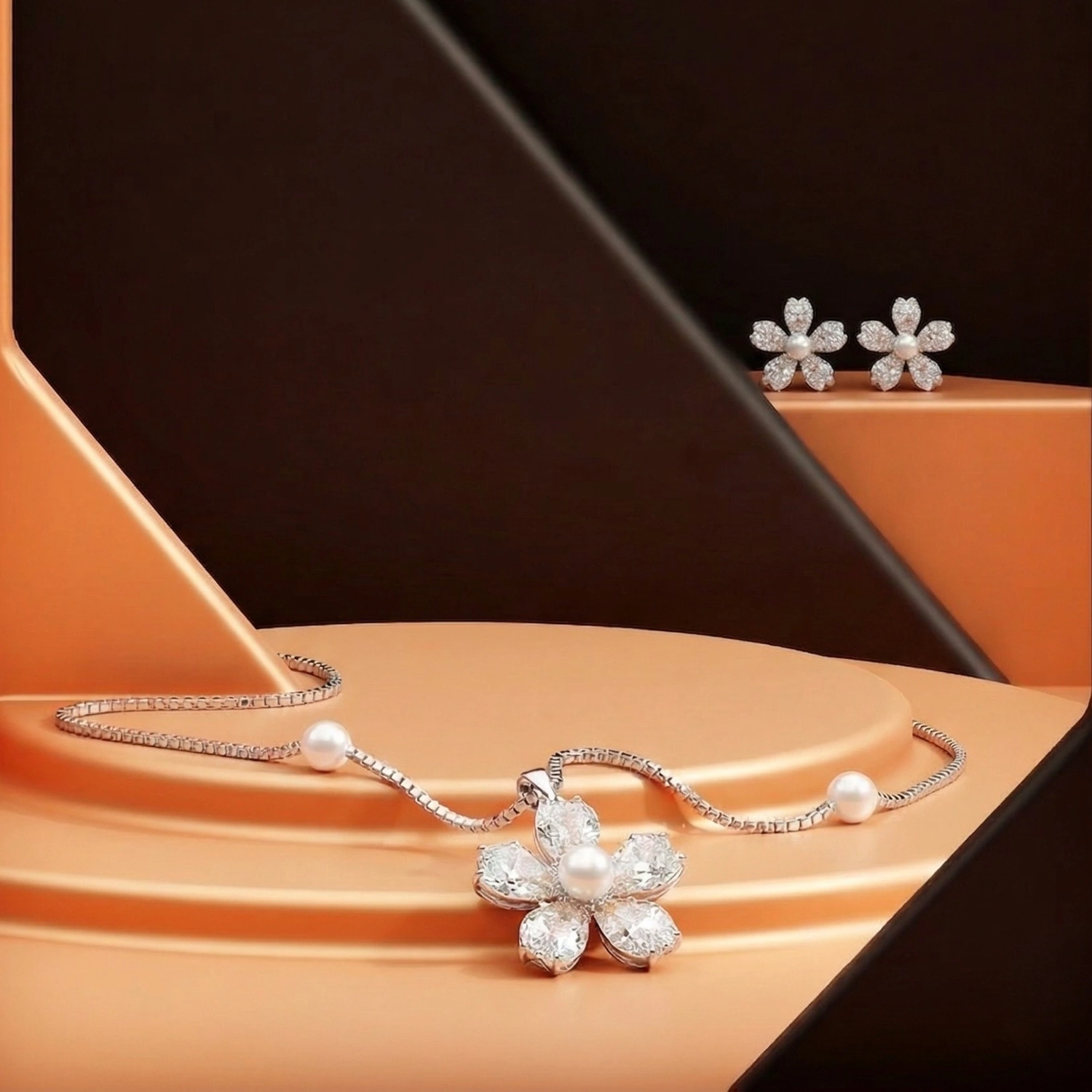 A radiant 925 sterling silver four-piece floral set featuring shimmering blossom motifs, lustrous pearl accents, and a modern square-link chain. Designed in a timeless refined style, this elegant set is perfect for weddings, gala events, and milestone celebrations.