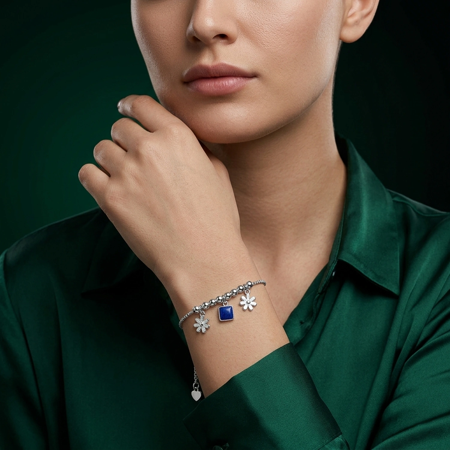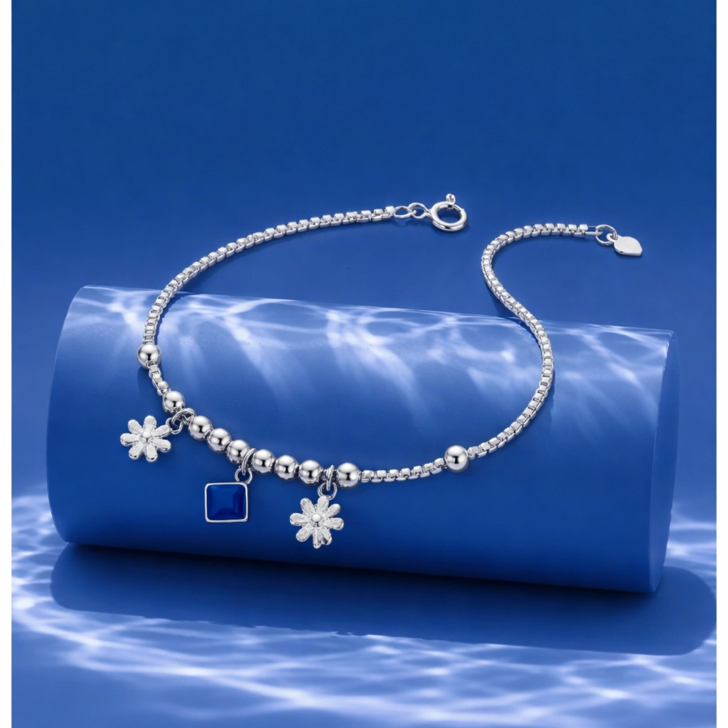 A refined 925 sterling silver box chain featuring playful floral charms and a striking blue centerpiece.