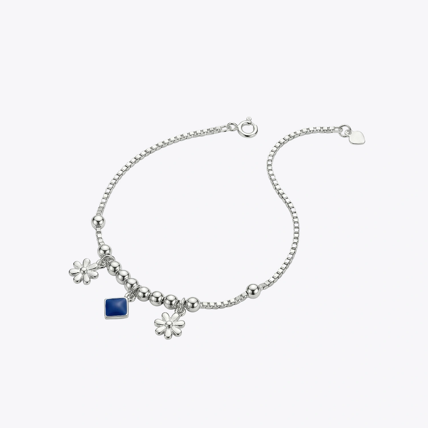 The Blue Charm Daisy Box Chain Bracelet is a refined 925 sterling silver bracelet featuring delicate floral charms and a striking blue centerpiece for a fresh, playful look.