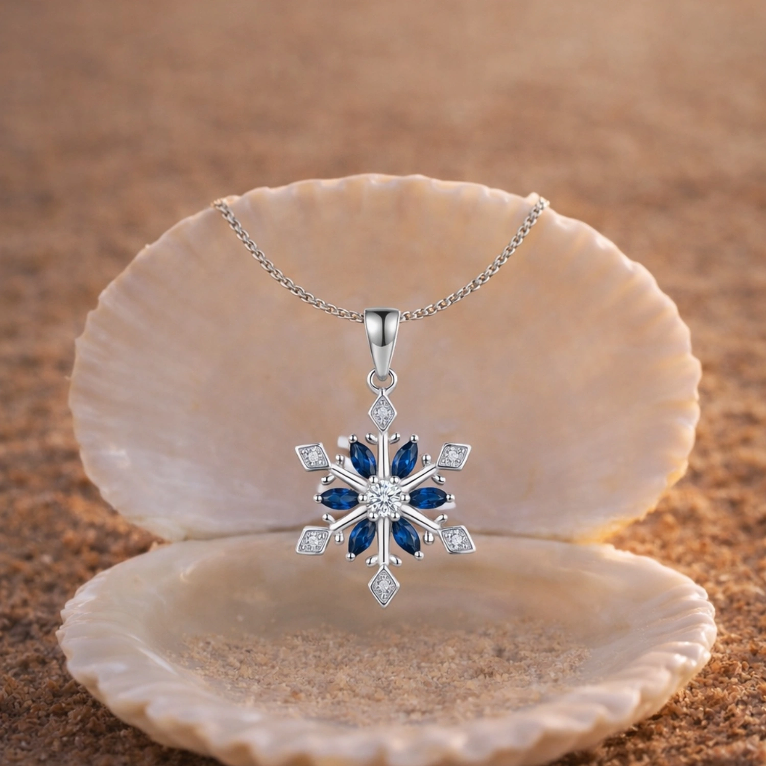 The Blue Sapphire Snowflake Pendant & Chain is a delicate 925 sterling silver necklace featuring a radiant snowflake motif adorned with deep blue stones for a refined, winter-inspired look.