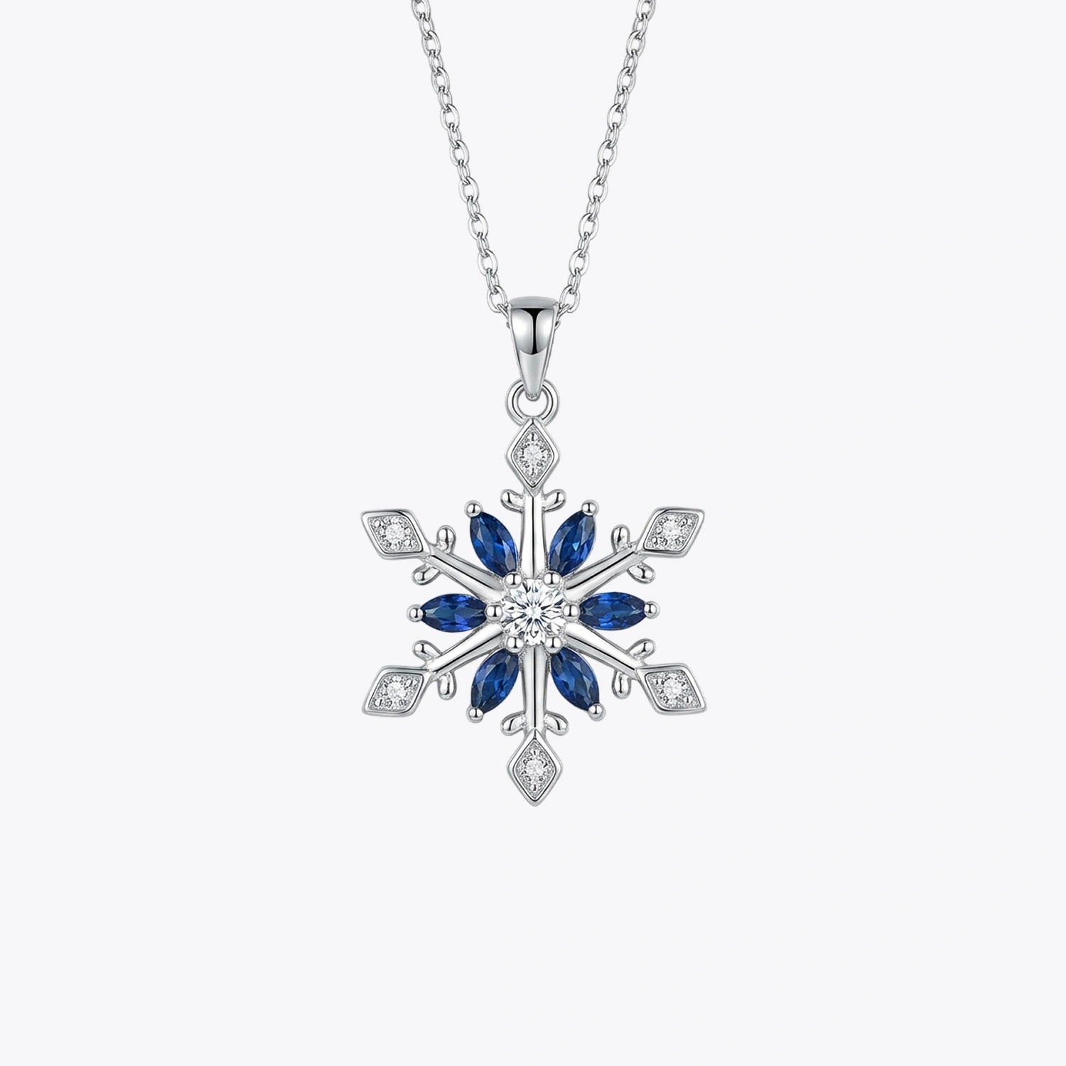 A delicate 925 sterling silver necklace featuring a vibrant snowflake motif accented with deep blue marquise stones.