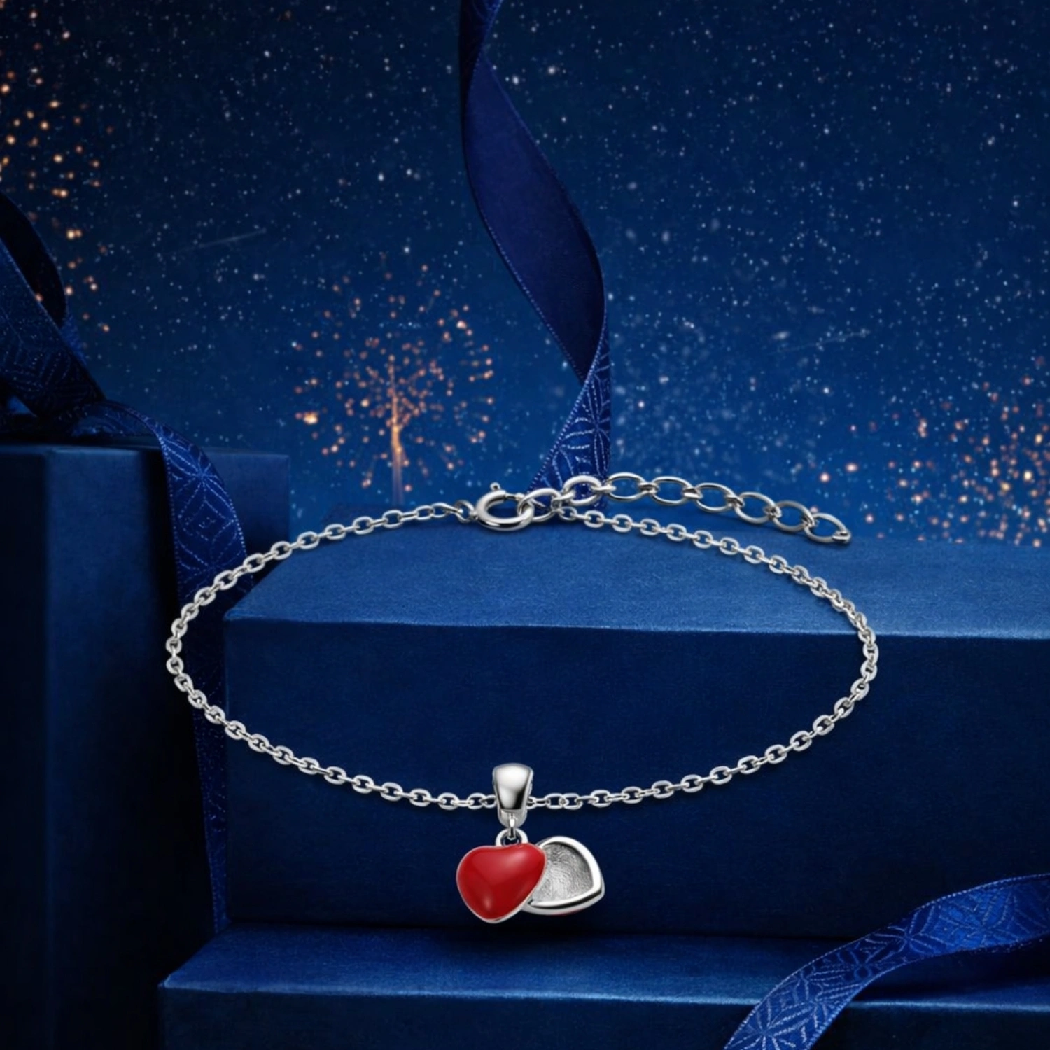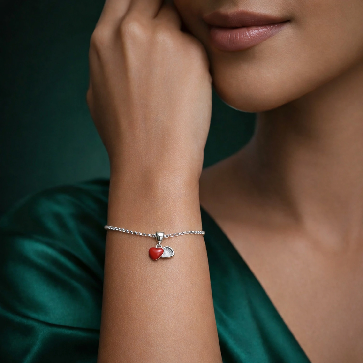 The Crimson Pulse Beaded Bracelet is a vibrant 925 sterling silver bracelet featuring a bold red enamel heart charm paired with polished silver beads for a lively, romantic touch.
