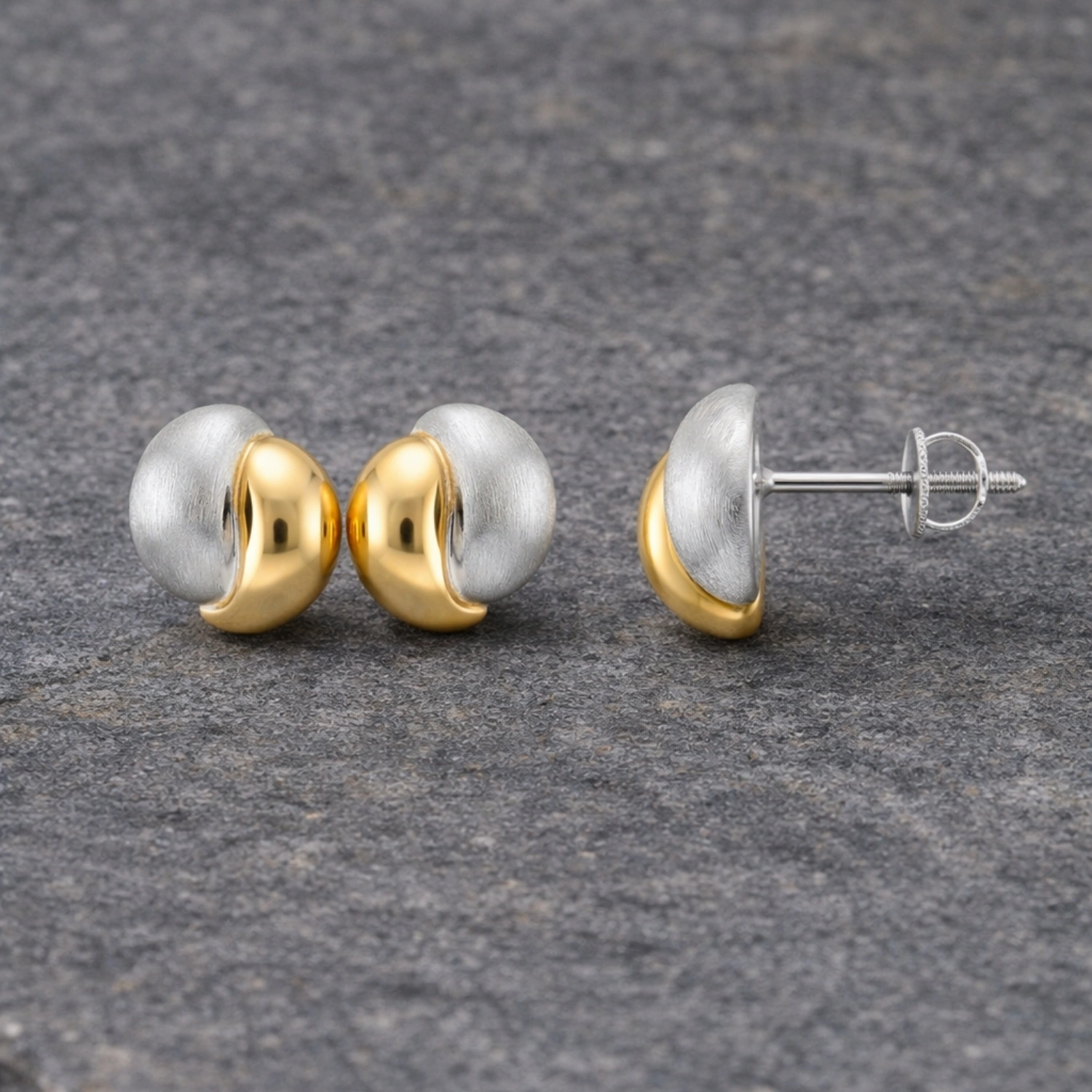 The Dual-Tone Crescent Moon Stud Earrings are elegant 925 sterling silver studs featuring a refined blend of gold plating and brushed silver for a sophisticated, modern look.