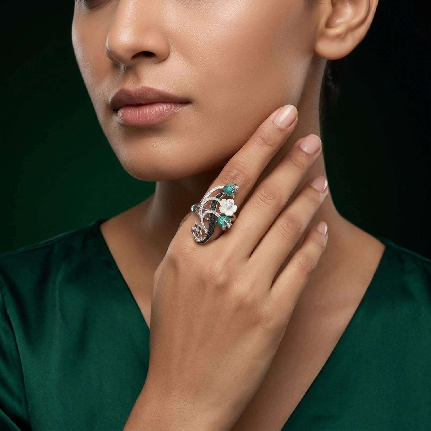 Ideal for both festive and formal occasions, the Emerald Floral Enchantment Ring pairs effortlessly with ethnic and western outfits alike. Whether worn as a statement accessory or gifted to someone special, it is a meaningful piece perfect for anniversaries, birthdays, or elegant celebrations, making it a treasured addition to any jewelry collection.
