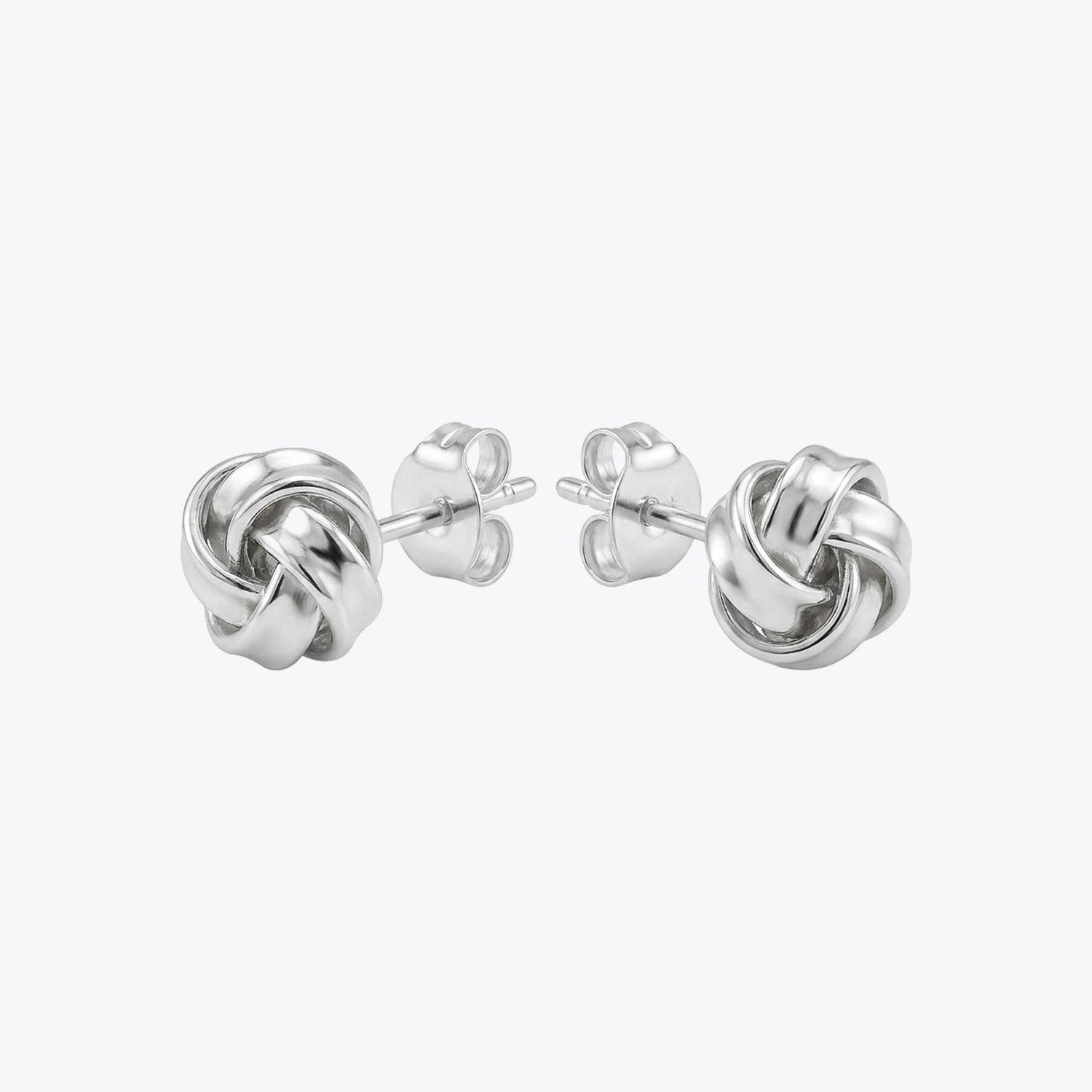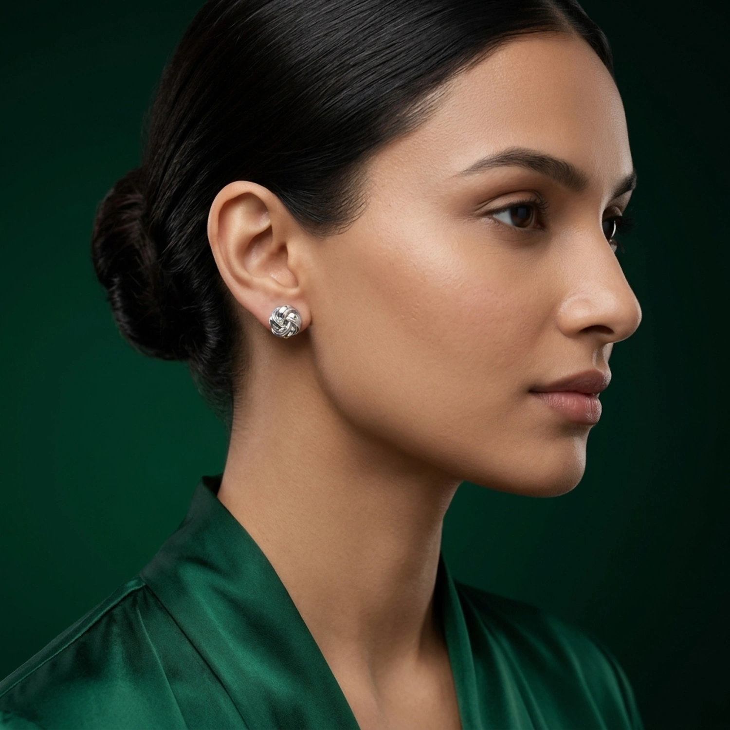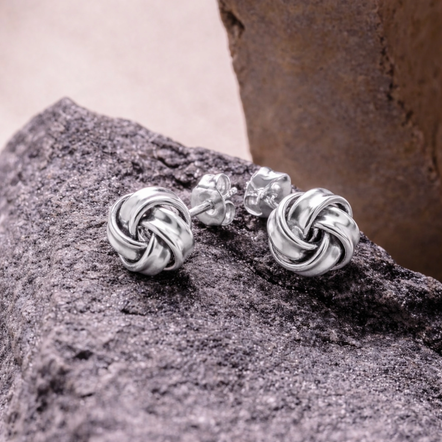 The Eternal Knot Silver Stud Earrings are handcrafted 925 sterling silver studs featuring a timeless love-knot design that symbolizes connection and elegance.