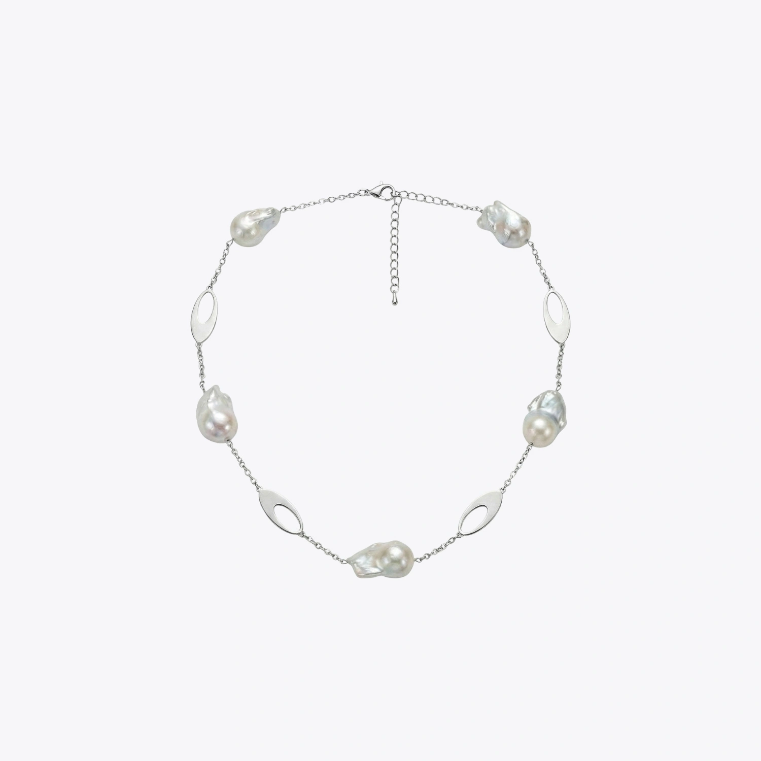 The necklace alternates lustrous natural baroque pearls with smooth open-oval silver charms, creating a graceful rhythm of texture, shine, and movement. Its sculptural composition highlights the individuality of every pearl, while the polished sterling silver links add sleek architectural balance. The matching teardrop pearl earrings complete the set with soft fluid elegance, making it both distinctive and timeless.