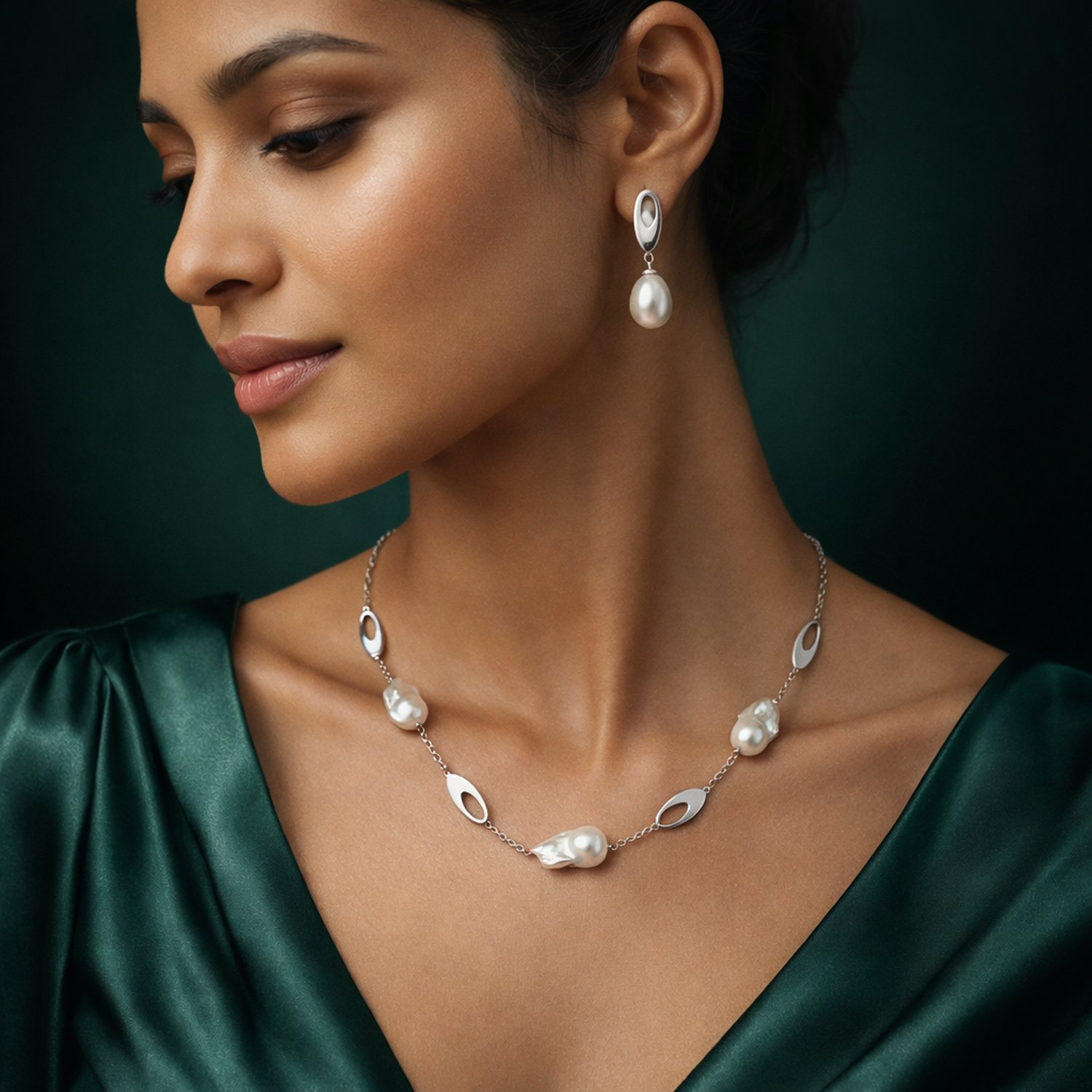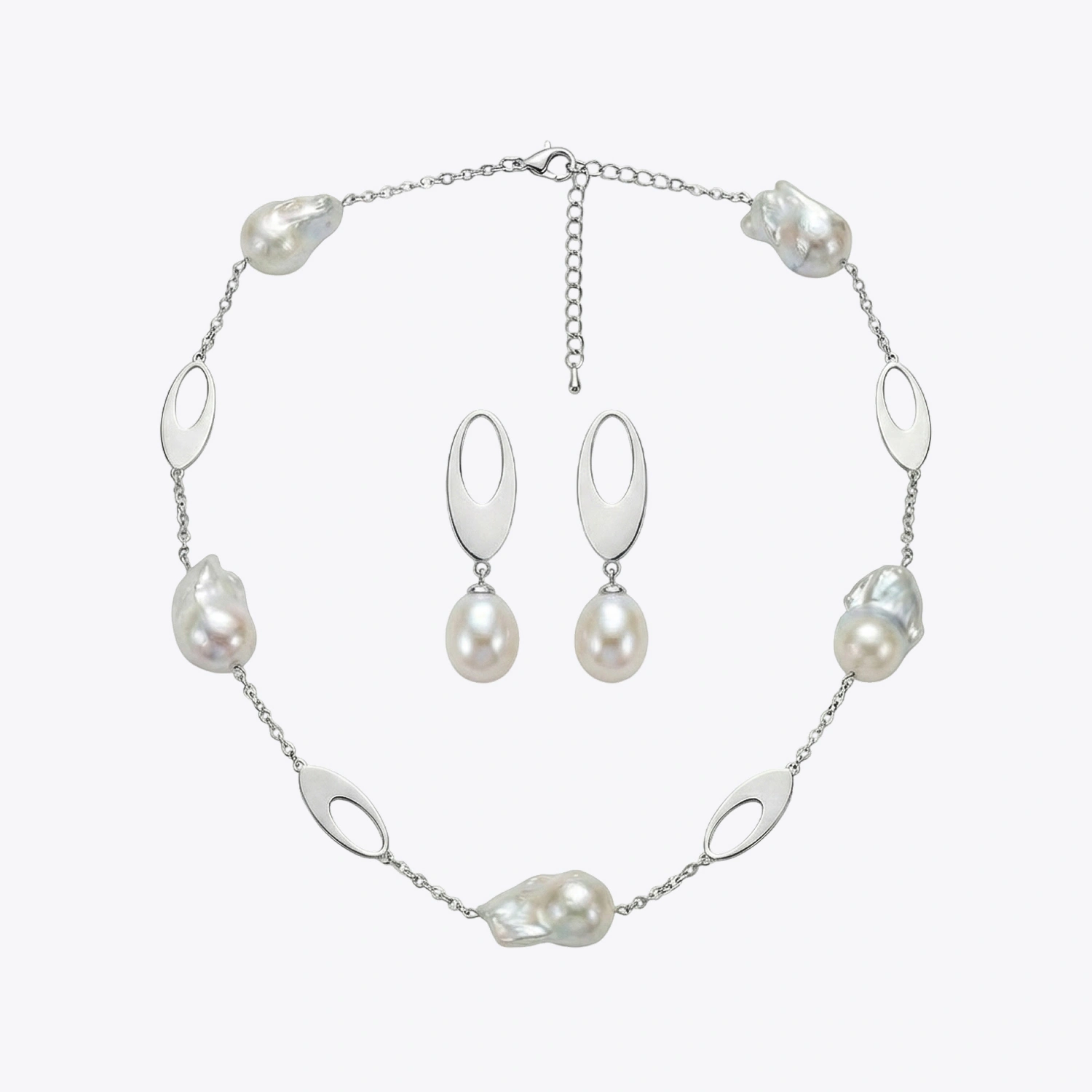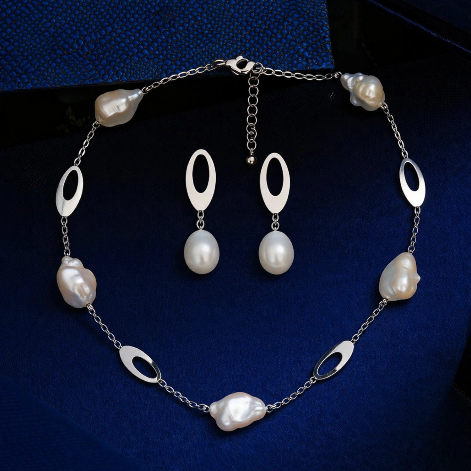 This elegant set features naturally irregular baroque pearls beautifully alternated with smooth open-oval silver links, creating a fluid and sculptural silhouette. The unique pearl shapes make every piece feel one-of-a-kind, while the silver ovals add a clean contemporary structure.
