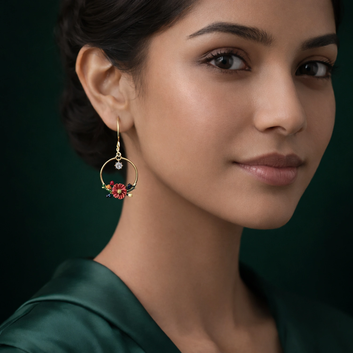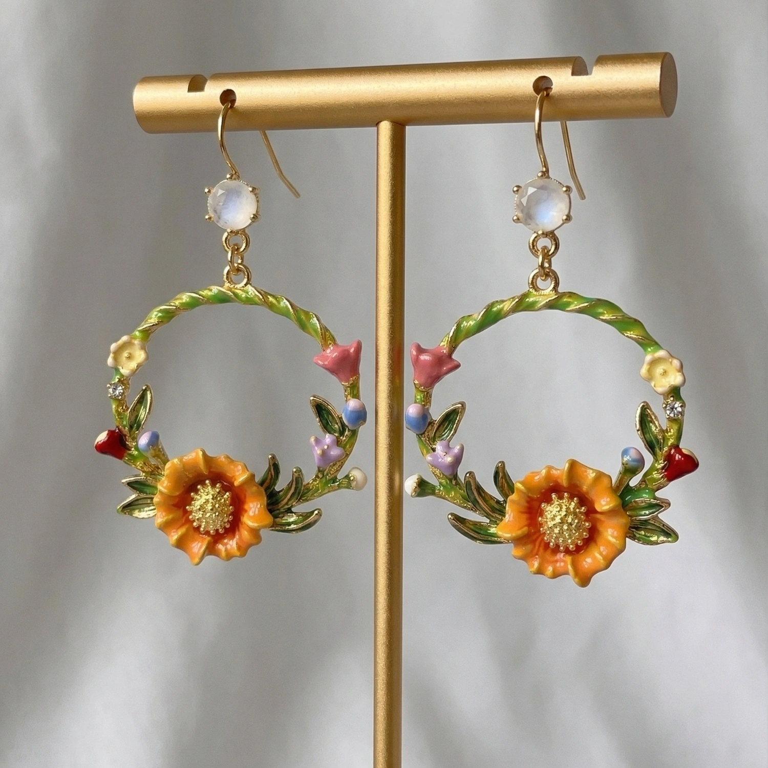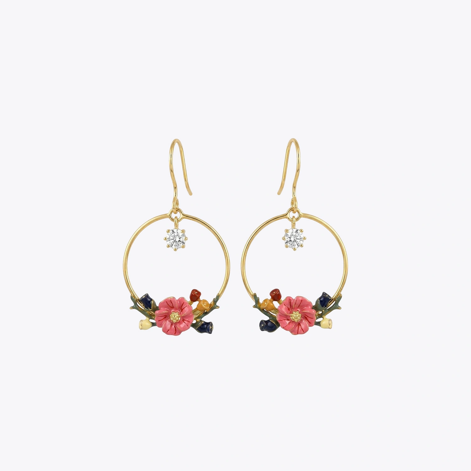 Elegant gold-plated 925 silver hoop earrings featuring a hand-painted enamel floral garden and a sparkling central stone.