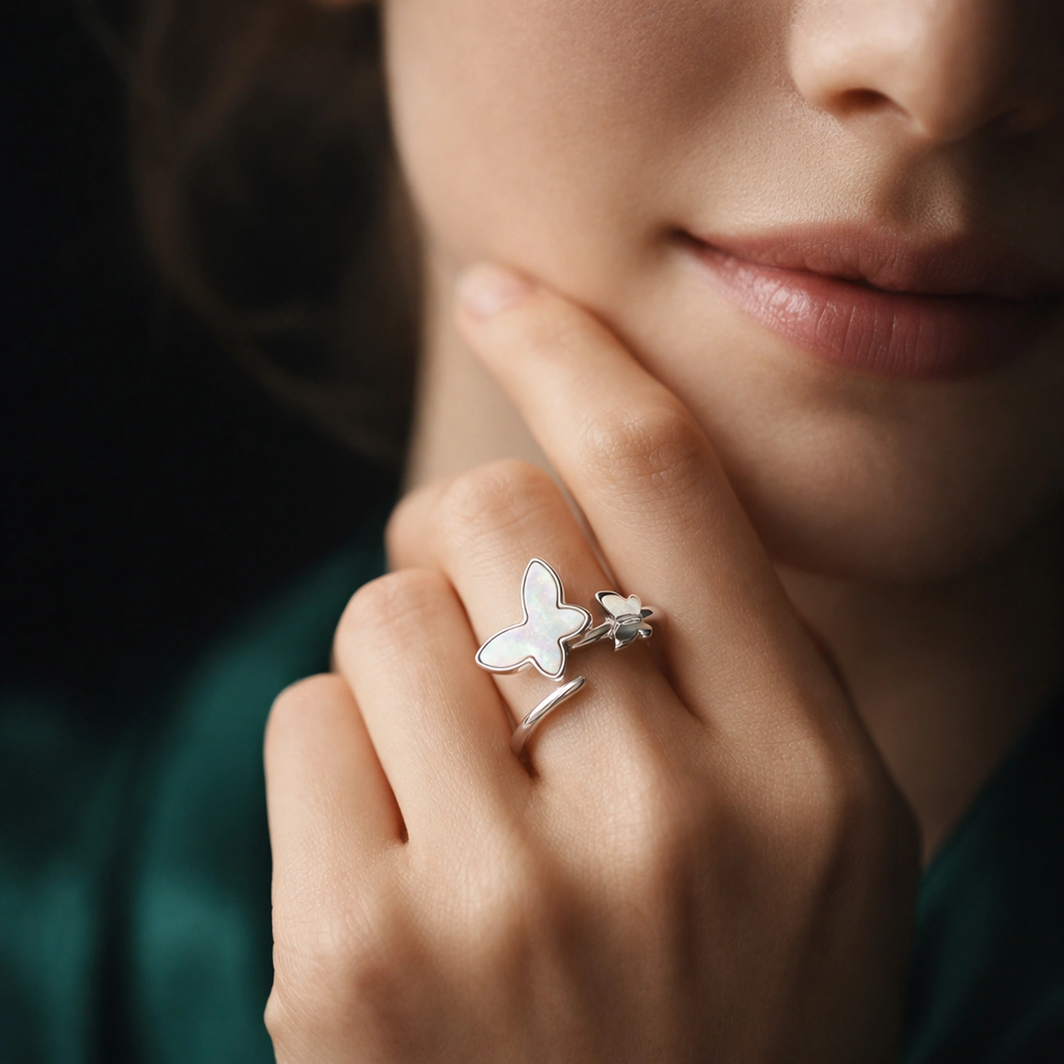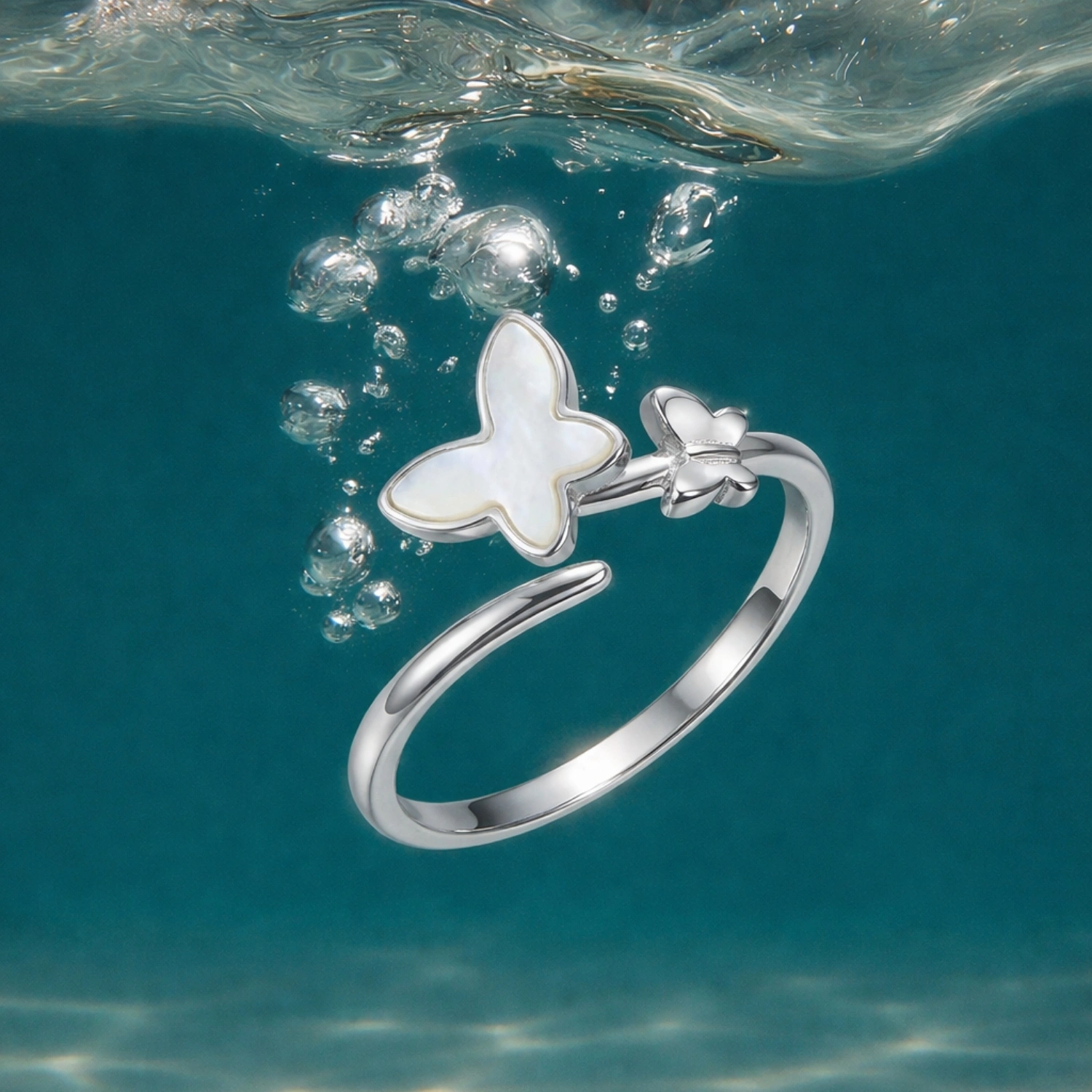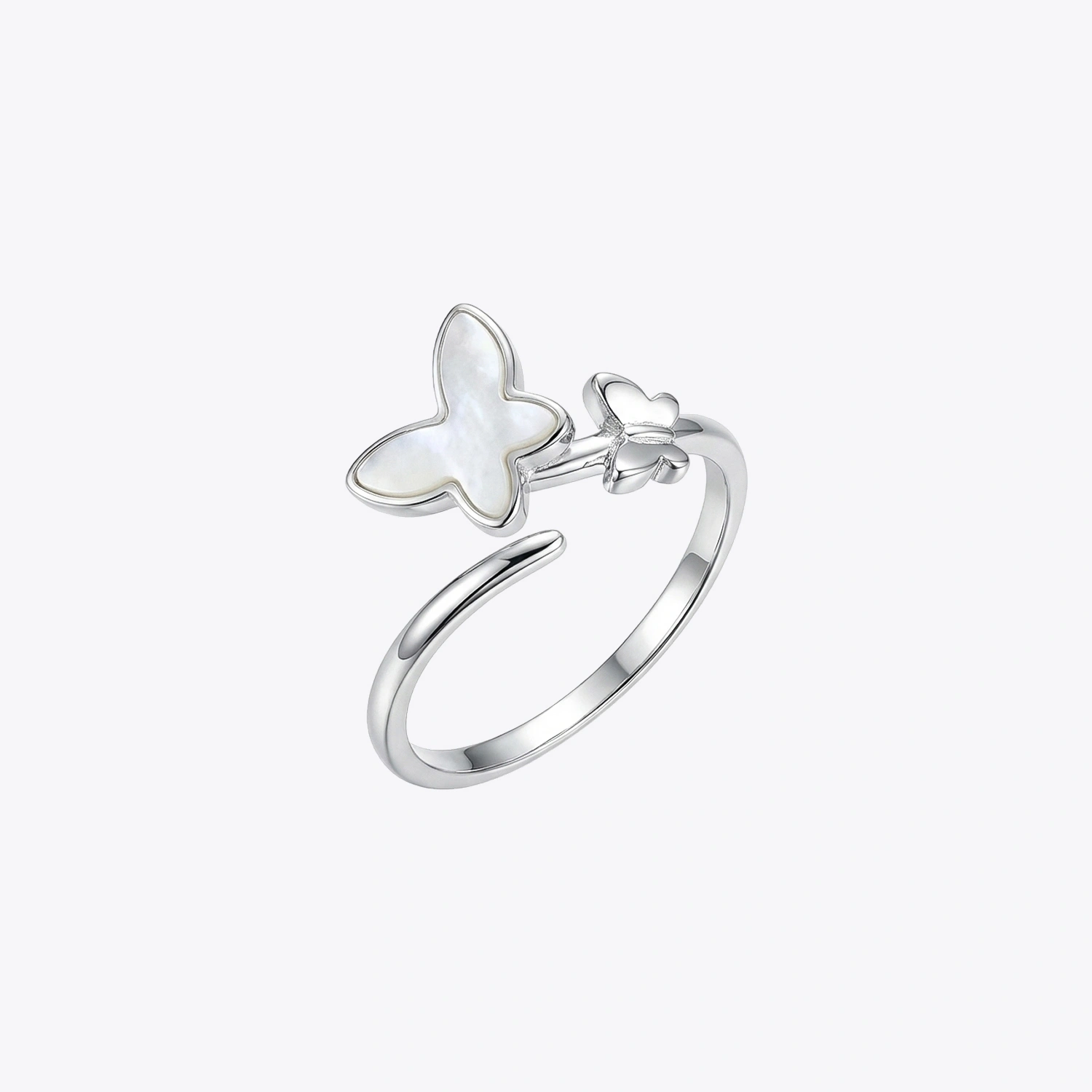 The Pearl Butterfly Bypass Ring is a whimsical 925 sterling silver ring featuring two delicate butterfly motifs in a graceful open-band design.